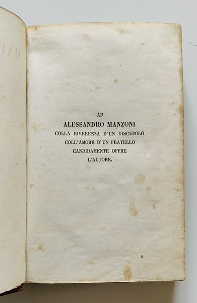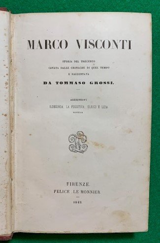 In 8°; (4), 571, (1) pp. Legatura coeva in mezza-tela rossa con autore e titolo impressi in oro al dorso. Filetti a secco al dorso. Piatti foderati con carta marmorizzata coeva, qualche strofinatura. Alcune lievi fioriture dovute alla qualità della carta e nel complesso esemplare in buone condizioni di conservazione. Dedica ad Alessandro Manzoni. Bell'edizione di questo celebre romanzo storico del grande scrittore e poeta italiano, Tommaso Grossi (Bellano, 23 gennaio 1790 - Milano, 10 dicembre 1853) amico fraterno di Carlo Porta e Alessandro Manzoni. Il romanza prende lo spunto dalle vicende di Marco Visconti, detto Balatrone (1289 circa - 5 settembre 1329) che fu stato un politico, un condottiero e un capitano di ventura italiano, signore di Lucca e di Rosate. L'opera ebbe enormi successo e fu tradotta in numerose lingue europee.