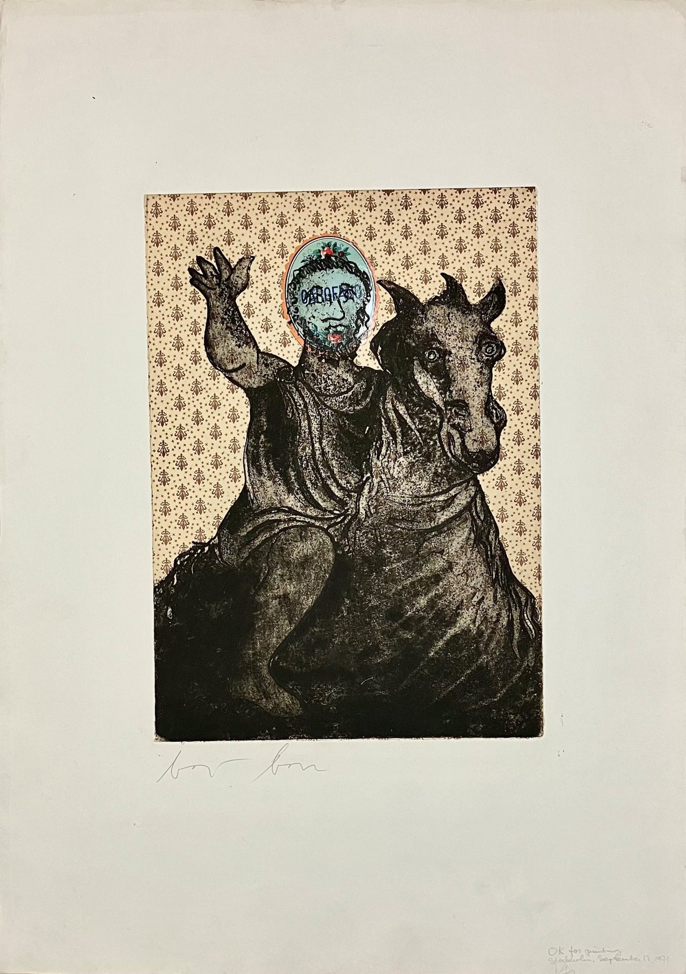 Acquaforte su carta varese e collage, esemplare bon a tirer, firma dell'artista a matita.