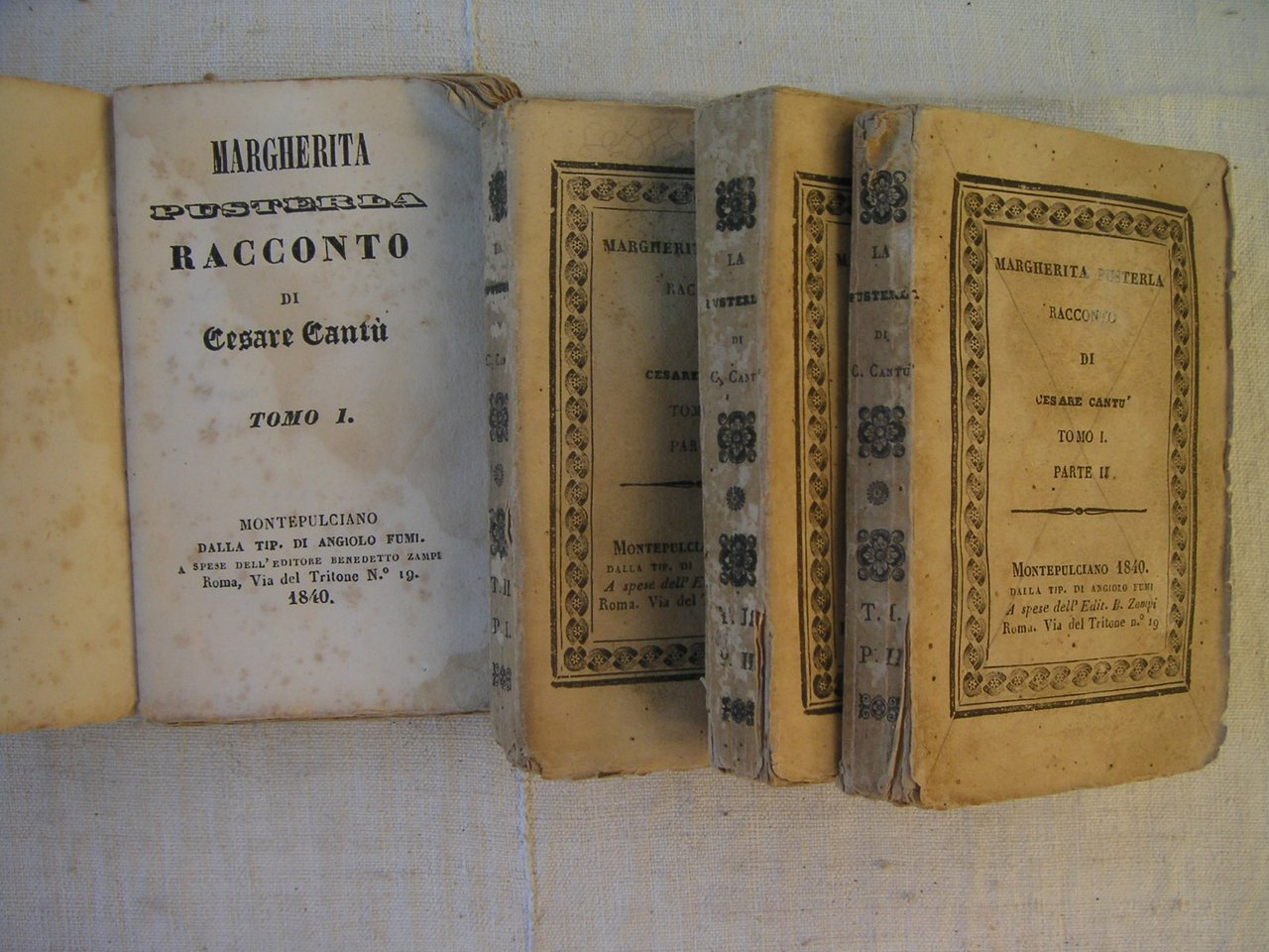 Opera composta da 4 volumetti, 12 x 8 cm; Tomo I-Parte I: pp. 224; Tomo I-Parte II: pp. 225-424, (1); Tomo II-Parte I: pp. 212; Tomo II-Parte II: pp. 213-466, (1); legatura in brossura ed. in carta colore sabbia con titoli e decori ai dorsi e con titoli ai piatti anteriori entro cornice a fili e decori neri, vaso con fiori al centro di cornice ai piatti post. dei volumetti; l'autore, Cesare Cantù (Brivio, 5 dicembre 1804 – Milano, 15 marzo 1895), è stato uno storico, letterato e politico italiano, deputato al parlamento dall'Unità d'Italia (1861) al 1867, fu il fondatore dell'Archivio storico lombardo; scrisse quest'opera, la sua più famosa, nelle carceri austriache dal novembre 1833 all'ottobre 1834, dove il Cantù era stato rinchiuso per la sua posizione idologica anti-austriaca, "a quel che si crede, servendosi di carta destinata a servizi ben più modesti e facendo uso di stuzzicadenti, come penna, e di nero fumo di candela come inchiostro" (Parenti, I, pp. 76-78 e V, pp. 87-92). Trattasi di un romanzo di tipo storico, manzoniano, che alle "tinte romantiche mescola note mistiche e crude ad un tempo", con protagonista Margherita Visconti, nobildonna milanese del XV secolo, meglio nota come Margherita Pusterla, dal cognome del marito. Il romanzo inizia con le parole dell'autore al lettore: "Lettor mio, hai tu spasimato? No. Questo libro non è per te. 1833". I volumetti presentano tracce d'uso, macchie e gore d'umido. Opera completa. Rif.: IT\ICCU\LO1\0802752. Cond.: nel complesso in buone condizioni generali con la normale patina del tempo.