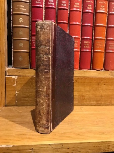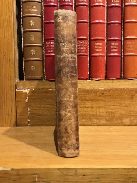 Rilegatura semplice in cartone, costa in pelle con scritte e decorazioni in oro.
