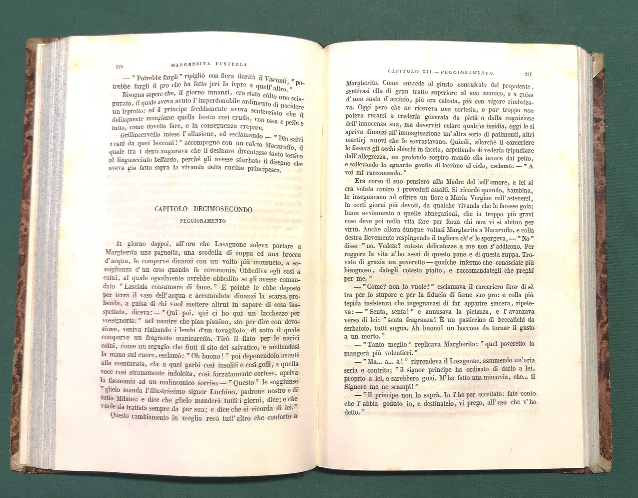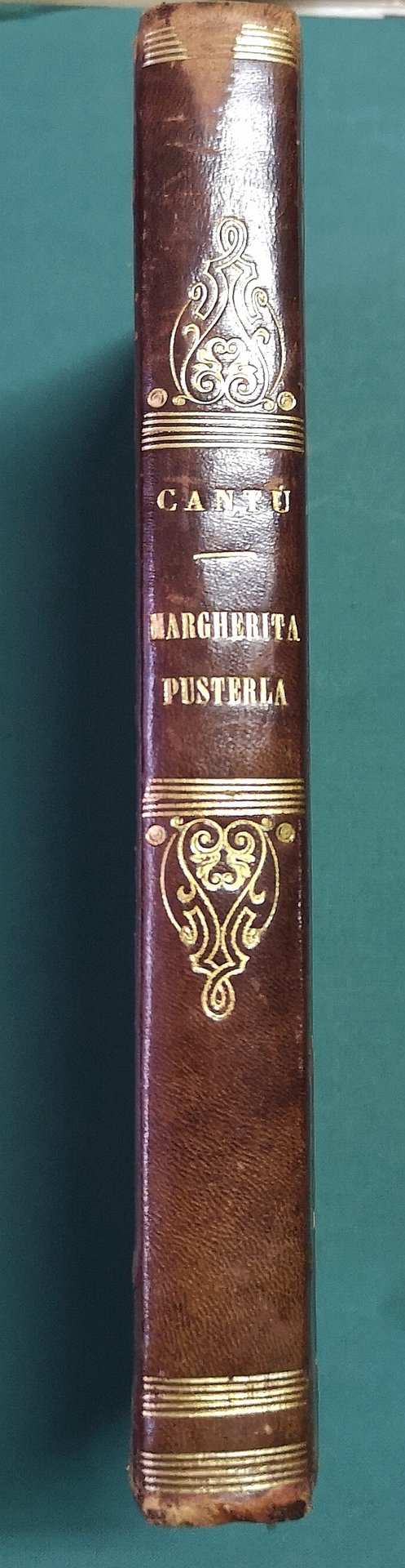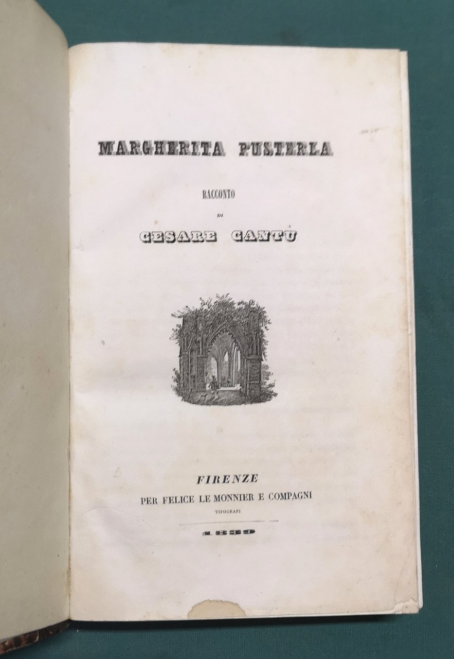 >in-8, pp. (4), 358, (2), bella leg. coeva in m. pelle, titolo e fregi in oro al dorso, tagli azzurri. Celebre romanzo storico che il Cantù, arrestato dalla polizia austriaca, scrisse in carcere dal nov. 1833 all'ottobre 1834, «...a quel che si crede, servendosi di carta destinata a servizi ben più modesti e facendo uso di stuzzicadenti, come penna, e di nero fumo di candela come inchiostro» (Parenti). Pubblicato per la prima volta nel 1838, il romanzo ebbe pronto e grande successo, fu spesso ristampato e tradotto in molte lingue. Ottimo esemplare, freschissimo. Parenti, Rarità bibliogr. '800, I pp. 76-8 e V, pp. 87-92.