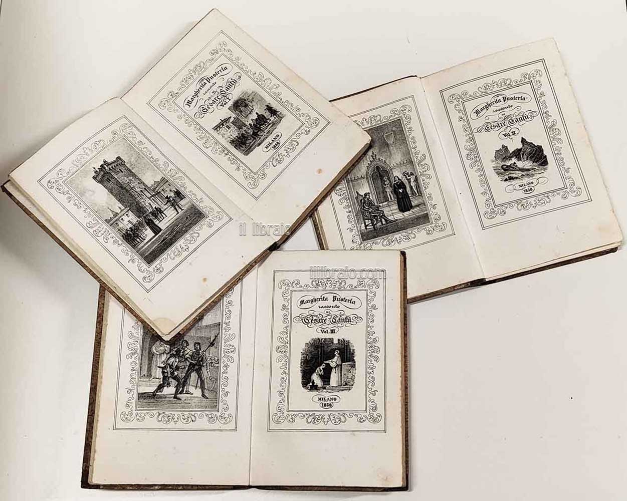 3 voll.; in 8°; pp. 238, 228, 178 + 3 tavv. (ill. in bn.); leg. coeva in mezza pelle con titoli e fregi in oro ai dorsi; 1^ ed. 3 frontespizi litografici figurati racchiusi da bordura, 3 antiporte litografiche con scene del romanzo. Prima edizione, priva di indicazioni di tipografo ai frontespizi (Il tipografo lo si deduce dalle indicazioni sul colophon del terzo volume), di uno dei più popolari romanzi storici del nostro Ottocento. Il Cantù scrisse questo romanzo storico nel solco manzoniano durante la sua prigionia nelle carceri austriache, dal novembre 1833 all'ottobre 1834, a quel che si crede, servendosi di carta destinata a servizi ben più modesti e facendo uso di stuzzicadenti, come penna, e di nero fumo di candela come inchiostro (Parenti, Rarità Bibliografiche dell'Ottocento, I, pp. 76-78 e V, pp. 87-92).