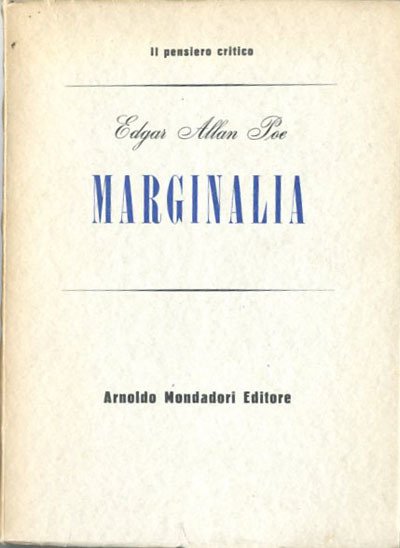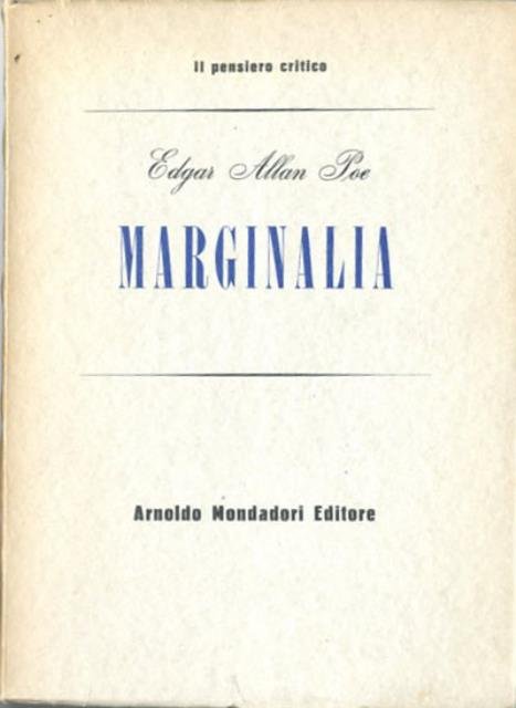 336 p. ; 21 x 15 cm. Il pensiero critico. Dal 1845 al 1849 Edgar Allan Poe intitolò come Marginalia alcune sue riflessioni e materiale frammentario che sono un contributo fondamentale all'elaborazione delle idee estetiche del 19. secolo. Traduzione dell'Inglese e prefazione di Luigi Berti. Brossura editoriale, coperta in cartoncino flessibile con bandelle. Codice libreria 1246.