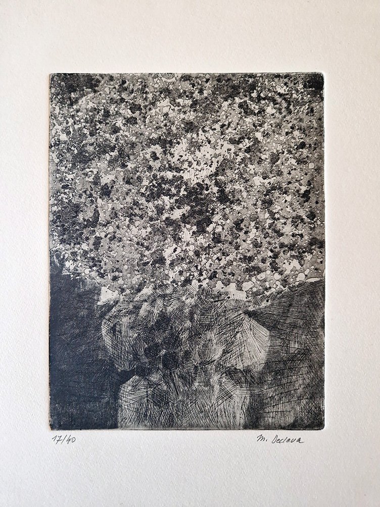 In folio; serie di 7 belle acqueforti di Decleva, tutte num. e firmate a matita dall'Artista (1930-1979); racchiuse, ognuna in un quartino di carta cina con una poesia di Hergouth (Graz 1925-2002). Il tutto a fogli sciolti, racchiusi in cartella t.tela edit. con tassello per il titolo al piatto. Rara edizione, tirata a soli 40 esemplari numerati. Firma dell'Artista croato (abile incisore attivo in Austria) e del noto poeta austriaco al colophon.<BR>decleva marginalien(vedi riproduz.)