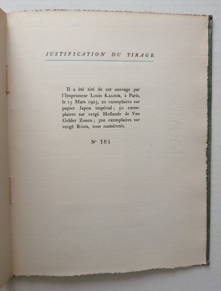 formato 25X20. Brossura con sovraccoperta e velina piegata a busta pagine 94. Carta uso mano con barbe. Tiratura in 500 esemplari numerati (181) su Carta Rives. Con 8 incisioni su rame di Daragnes, di cui una a colori con velina al controfrontespizio. Ottima copia