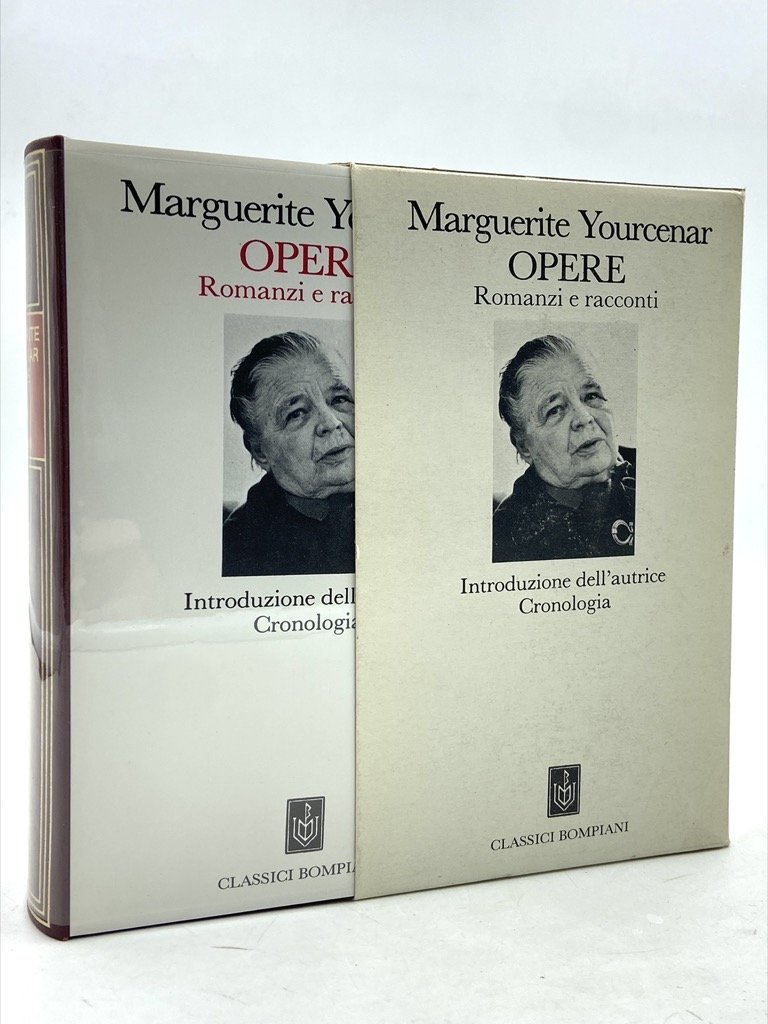 Legatura editoriale in pelle con sovraccoperta (dei soli piatti), acetato e custodia illustrata, cm 17.5 x 11, pp XXXVIII 1300 (6). Collana Classici Bompiani. Introduzione dell’autrice. Contiene Alexis o il trattato della lotta vana, Il colpo di grazia, Moneta del sogno, Memorie di Adriano, L’opera al nero, Anna, soror…, Un uomo oscuro, Una bella mattina, Fuochi, Novelle orientali.