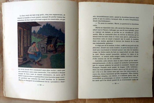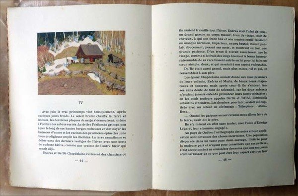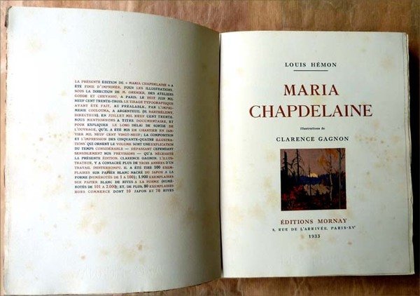 Un volume broché de format petit in 4° de 2 ff; (faux titre, justification, titre); 206 pp.; nombeuses compositions en couleurs de Clarence Gagnon. Couverture rempliée imitant le cuir avec lacets sur les coupes; Chemise et étui brun; imitant la peau de serpent. Pâles rousseurs sur les 3 premières pages et les dernières; sinon intérieur frais. Petits défauts sans gravité à l'étui. Un des 70 hors commerce sur Rives non numéroté. Charmant exemplaire. Voir les photos.