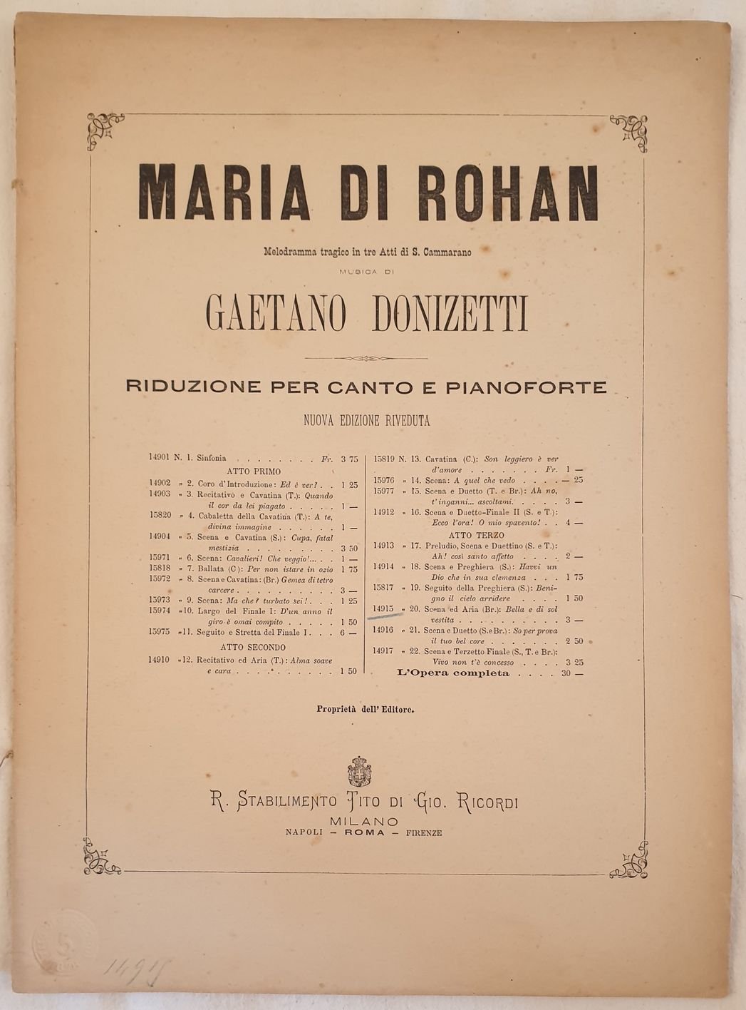 MARIA DI ROHAN MELODRAMMA TRAGICO IN TRE ATTI DI S. CAMMARANO MUSICA DI GAETANO DONIZETTI RIDUZIONE PER PIANTO E PIANOFORTE