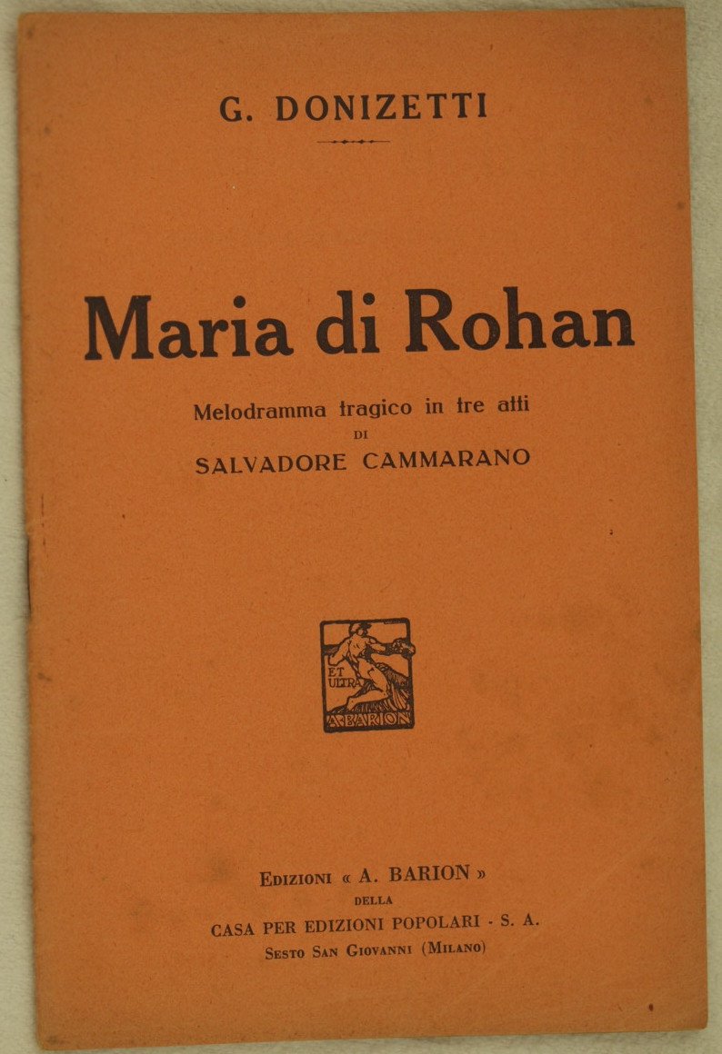 In 16. Dim. 18,5x12 cm. Pp. 32. Bel libretto d'opera del 1933 dell'opera "Maria di Rohan" di Gaetano Donizetti (1797-1848) su libretto di Saint Georges e Bayard.<BR>La prima rappresentazione ebbe luogo il 5 giugno 1843.<BR>In buone condizioni Brossura editoriale in buone condizioni generali con lievi usure ai margini e dorso. Macchie (vedere foto). Legatura in buone condizioni. All'interno le pagine si presentano in buone condizioni con fioriture. Beautiful booklet of 1933 of the work in three acts "MAria di Rohan" by Gaetano Donizetti (1797-1848).<BR>The first representation took place the 5th of june 1843. In good conditions Editorial cover in good general conditions slightly worn in the edges and spine. Stains. Binding in good conditions. Inside pages are in good conditions with foxings.
