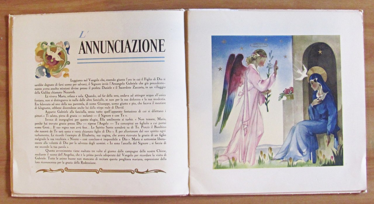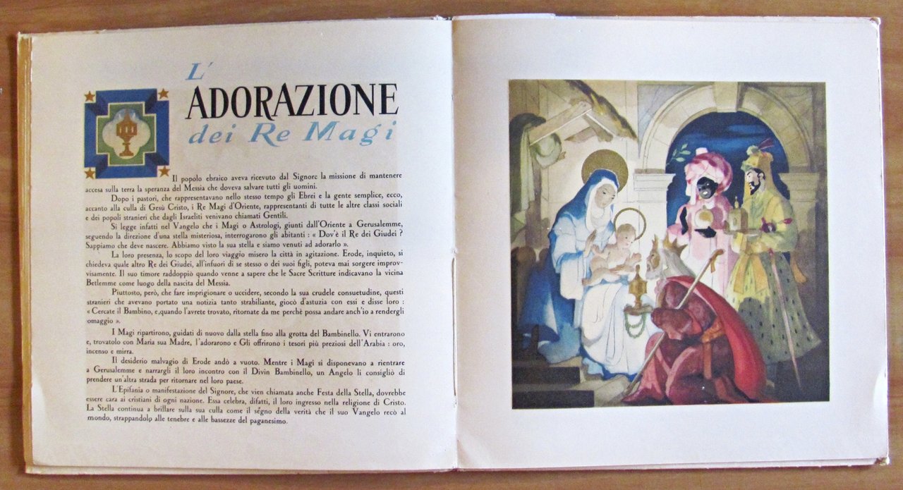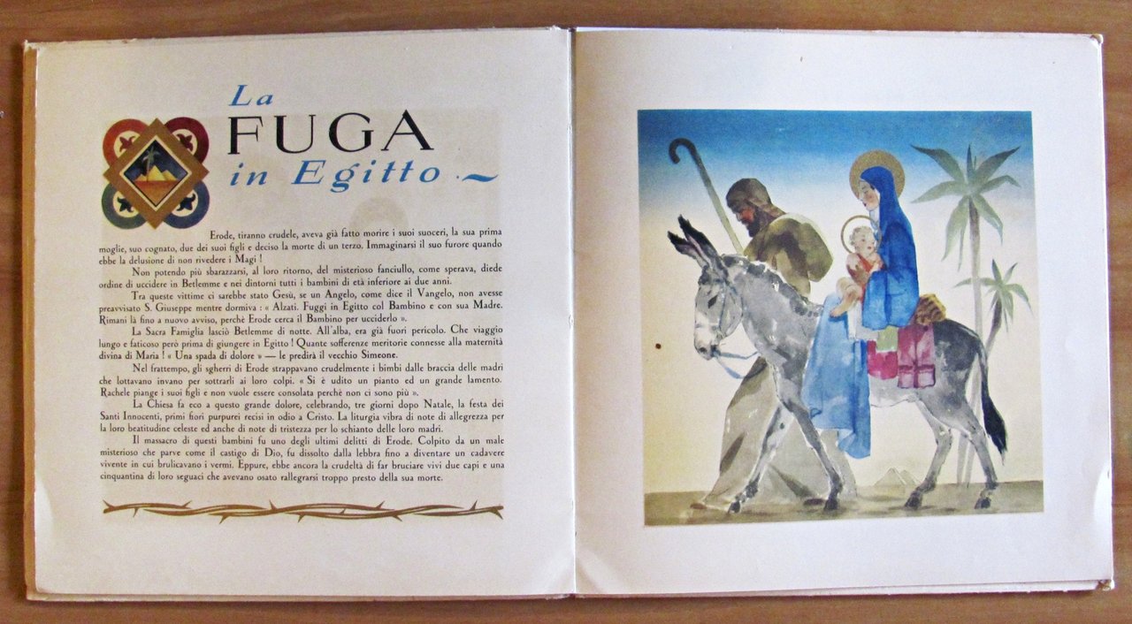 Bellissime illustrazioni acquarellate con ori al rilievo di G. Mercier. Ed. Domani - Roma, I edizione 1948. Cartonato editoriale con lievissime tracce del tempo alle copertine e piccola imperfezione alla cuffia inferiore del dorso. Internamente è rimasto legato un punto di cucitura della cerniera su tre ma il libro e le pagine risultano perfettamente integre e freschissime. 25x25; pp.30 non numerate. Raro e in Buonissimo stato , Molto buono (Very Good)