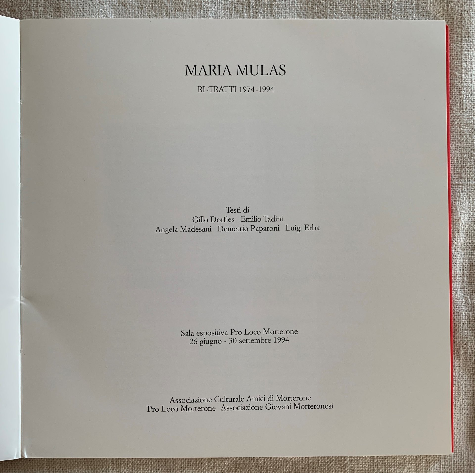 - Novecento cataloghi mostre personali, arte italiana moderna e contemporanea, fotografia, ritratti 1964-1994, Maria Mulas, Sala Espositiva Pro Loco Morterone (prov. Lecco) 1994