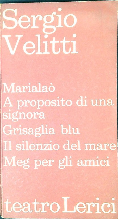 Velitti, Sergio Marialao ; A proposito di una signora ; Grisaglia blu ; Il silenzio del mare ; Meg per gli amici. Milano, Lerici 1964, 116 p. ; 23 cm. (47767)