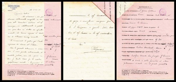 lotto comprendente una lettera manoscritta e firmata, un questionario compilato ed una comunicazione di Mariano Pio Rumor; la lettera è di 2 facciate su carta intestata "Tipografia Pontificia Vescovile S. Giuseppe G. Rumor Vicenza" (la tipografia del padre di Rumor); la comunicazione e il questionario sono diretti a Rumor quando era direttore della tipografia; buoni ess.