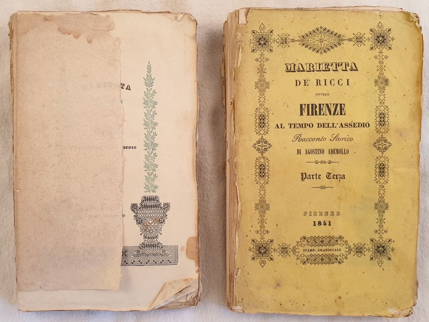 Edizione del 1841 di questo racconto storico scritto dall'avvocato scrittore e storico Agostino Ademollo (1799-1841). L'opera era composta da tre tomi, siamo purtroppo in possesso della seconda e terza parte solamente. Doppio frontespizio di cui uno figurato. In discrete condizioni. Copertina editoriale in mediocri condizioni con usure ai margini e dorso. Piatto anteriore del secondo tomo mancante. Legatura in mediocri condizioni con rotture. Pagine in buone condizioni con rare fioriture. In 8. cm 19,5x12,5. Pp. 313-1126+(2). Edition of 1841 of this hystorical novel written by the lawyer writeer and historian Agostino Ademollo (1799-1841). the work was made up of three tomes, unfortunately we only have the second and third part. Double title page of which one is figurated. In fair conditions. Editorial cover in poor conditions slightly worn in the edges and spine. Front plate of the second tome is loss. Binding in poor conditions with cracks. Pages in good conditions with occasional foxings. In 8. cm 19,5x12,5. Pp. 313-1126+(2)