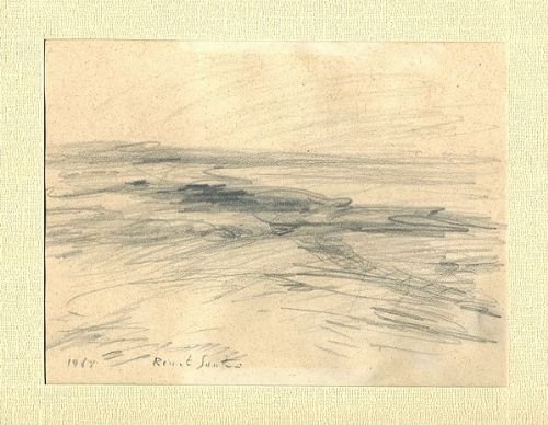 Disegno a lapis, dove si identifica chiaramente una delle classiche marine disegnate e dipinte dall'artista. Foglio di carta di cm. 20x15, con firma e data autografa dell'artista.