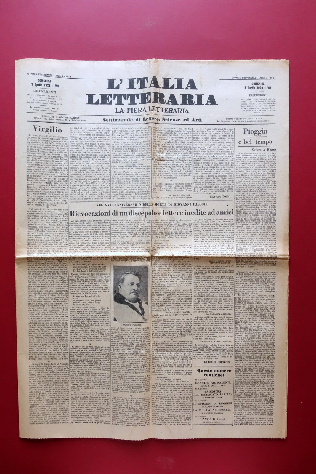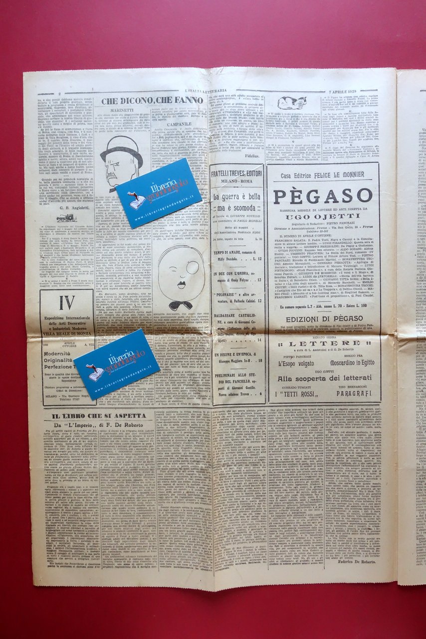 Giornale settimanale, Che dicono, che fanno - Marinetti" in "L'Italia Letteraria" settimanale di lettere, scienze e arti anno I - numero 1 Roma, 7 aprile 1929 Roma 1929; cm 58,5x42,5; pp. 8 con qualche ill. in b/n; esemplare a fogli sciolti. Numero completo. Condizioni di conservazione Buone condizioni con tracce d'uso, pieghe di conservazione, leggeri accenni di ingiallimento dovuti al tipo di carta, alla parte centrale una lieve ombra di gora di vecchia umidità che non compromette la lettura del testo. Qualche minima brunitura. All'incrocio delle pieghe della prima pagina una minuscola mancanza. A pagina 2 l'articolo sopra indicato, a firma Bebé Cadum e corredato da una piccola illustrazione in bianco e nero di Giacomo Balla. Il testo verte sul maggio parigino e sulla partecipazione dei futuristi alle rassegne artistiche, letterarie, teatrali, musicali tenutesi nella capitale francese. Completo. SC03.D18473 N F "