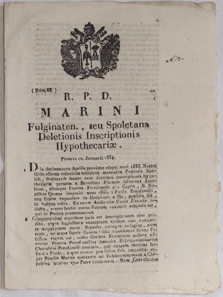 MARINI FULGINATEN SEU SPOLETANA DELETIONIS INSCRIPTIONIS HYPOTHECARIAE VENERIS 10 JANUARII 1834