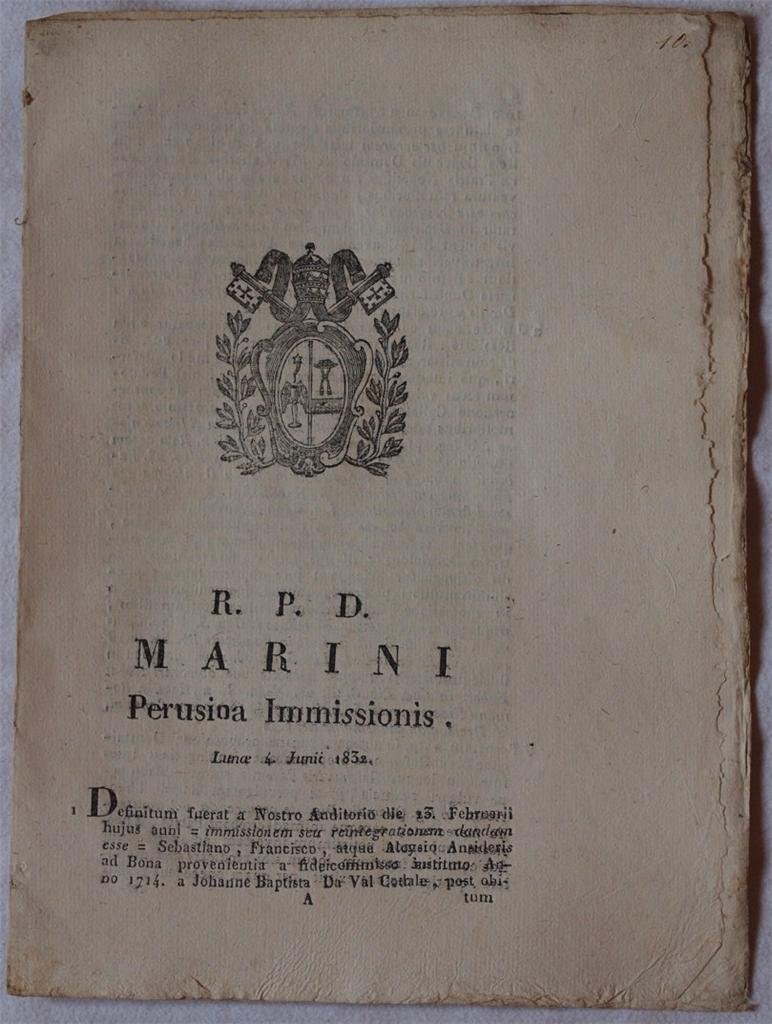 In 4. Dim. 28,5x21 cm. Pp. (8). Interessante pubblicazione del 1832, una sentenza del Tribunale della Sacra Rota del 4 Giugno 1832 per una causa nella diocesi di Perugia. Si tratta della causa sulla sentenza del 23 Febbraio 1832 per l'immissione e reintegrazione dei beni a Sebastiano, Francesco e Luigi Ansideri provenienti da fideicommissadel 1714 di Giovanni Battista Da Val Costale. In buone condizioni. Copertina assente. Legatura assente. All'interno le pagine si presentano in buone condizioni con fioriture e bruniture. In barbe. Interesting pamphlet of 1832, a sentence of the Trial of Sacra Rota for a trial of 4th of June 1832 in the diocesis of Perugia. It is the trial for the sentence of the 23rd of February 1832 for immission and reintegration of goods to Sebastiano, Francesco and Luigi Ansideri coming from fideicommissary of 1714 of Giovanni Battista Da Val Costale. In good conditions. Cover is missing. Binding is missing. Inside pages are in good conditions with foxings and yellowings. Uncut copy.
