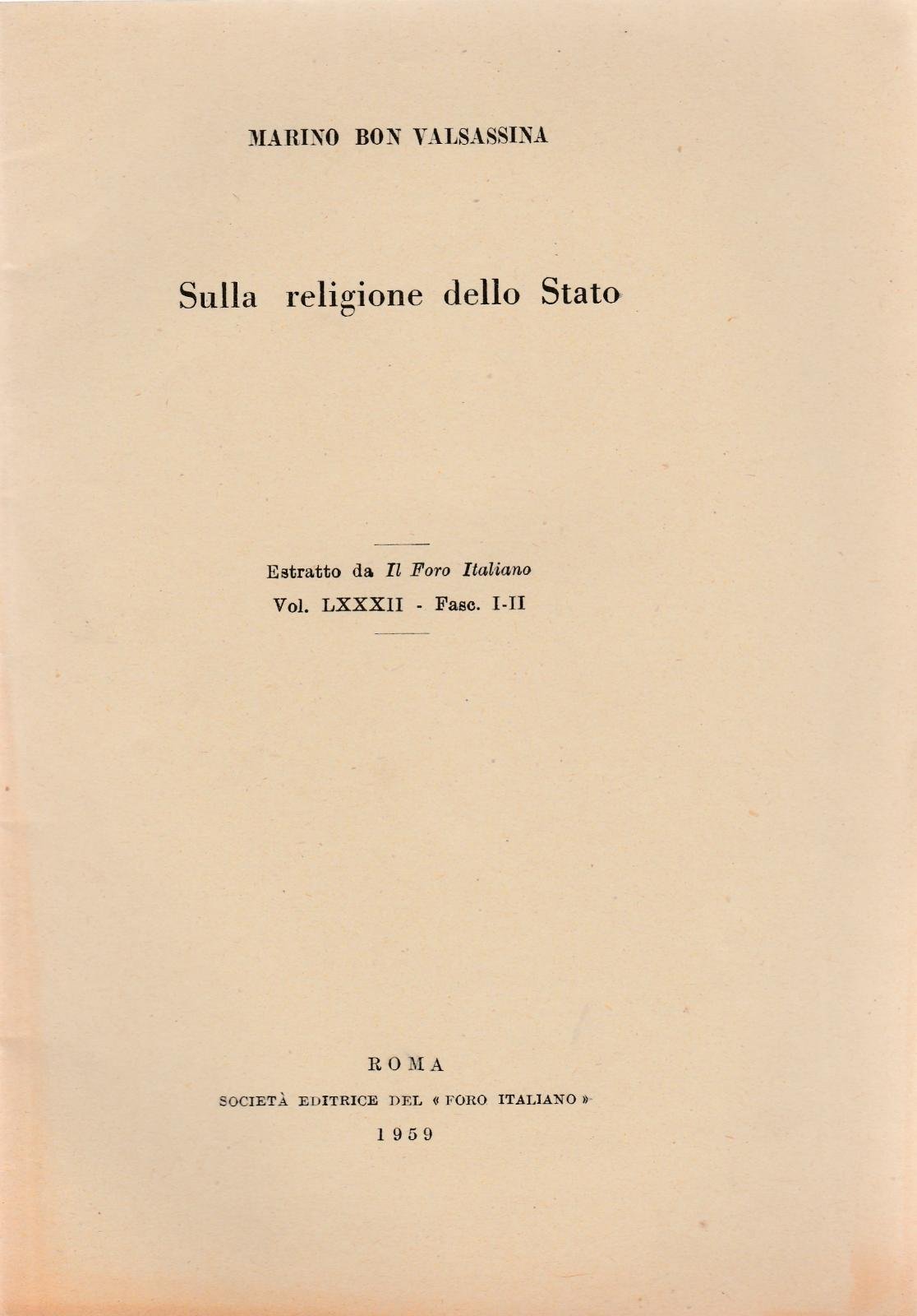 MARINO BON VALSASSINA SULLA RELIGIONE DI STATO ESTRATTO DA IL FORO ITALIANO VOL. LXXXII FASC. -II IL FORO ITALIANO ROMA 1959 L 4560 COPERTINA EDITORIALE MORBIDA CON UN ALONE AL MARGINE, INTERNO IN BUONO STATO, N. PAG. 49 CM. 21 X 15