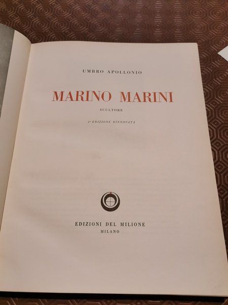 Monografia dedicata a Marino Marini; volume n.3 della collana "Monografie di Artisti Italiani contemporanei". Stato molto buono (sovracc. con piccole mancanze e tracce d'uso; piccolo restauro con scotch da restauro all'antiporta; lieve ondulazione delle pagine, per tipo di carta; per il resto volume integro e completo.