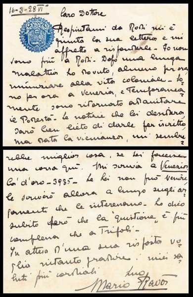lettera manoscritta e firmata di Mario Ravà datata 16 marzo 1928 di 2 facciate suddivise in 2 biglietti suddivisi; buon es.