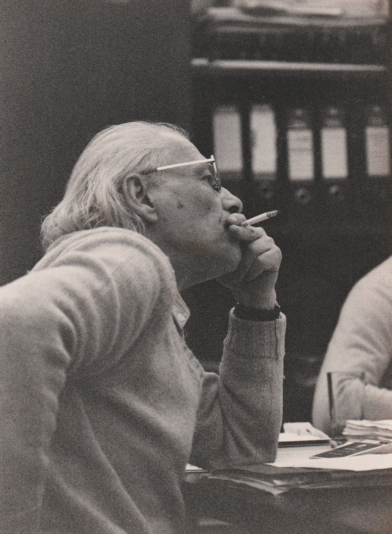 Vintage print, al verso firma di Fabio Emilio Simion, il "fotografo preferito" di Gianni Sassi, di cui ha testimoniato per più di vent'anni le peripezie imprenditoriali in campo culturale, artistico, musicale nonché sperimentale. La rivista Alfabeta (n. 1-114, 1979-1988) rappresentò uno degli ultimi palpiti di critica intellettuale sopravvissuta alla disgregazione degli anni '70. Balestrini ne fu in qualche modo lo spirito guida, con la complice sensibilità di Gianni Sassi e Gino Di Maggio insieme a molte altre firme autorevoli. E Fabio Emilio Simion il fotografo.