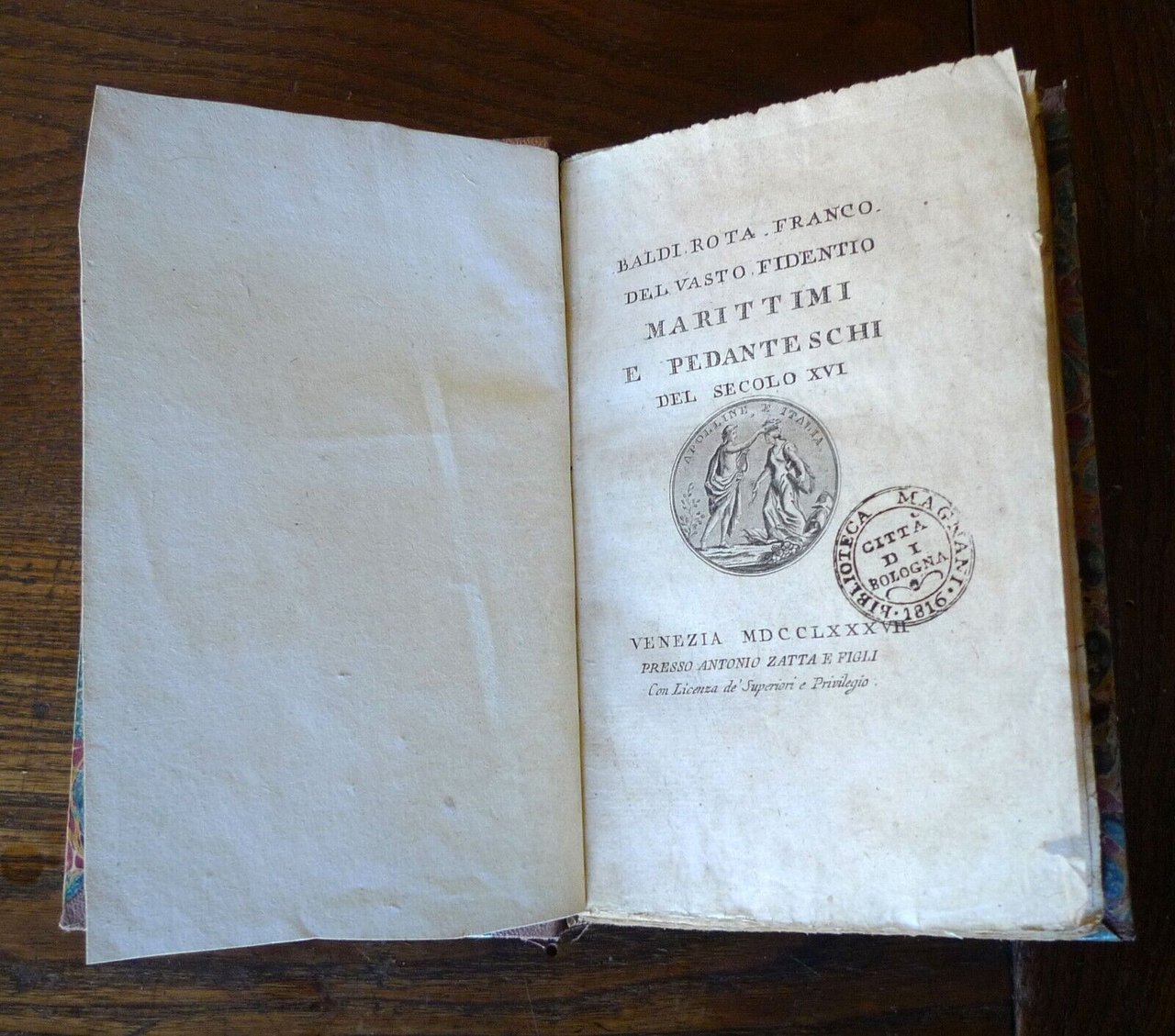 BALDI ROTA FRANCO DEL VASTO FIDENTIOMARITTIMI E PEDANTESCHI DEL SECOLO XVI.VENEZIA MDCCLXXXVII (1787),presso Antonio Zatta e Figli,copertina rigida, rilegatura posteriore in mezza tela,18x11 cm., pp.[6],263,18 incisioni su rame,peso: g.300