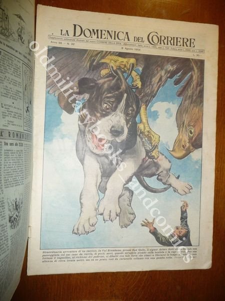 DESCRIZIONE: LA DOMENICA DEL CORRIERE 1° luglio 1956. In copertina: " Val Brembana un cucciolo di cane viene afferrato da un'aquila." Al retro: "Marlene DIETRICH visita un ammalato che non si era potuto al suo spettacolo" CONDIZIONI DELL'OGGETTO: Ottime lievi pieghette, con sovracc. azzurrina. PESO/WEIGHT: 92 g without package
