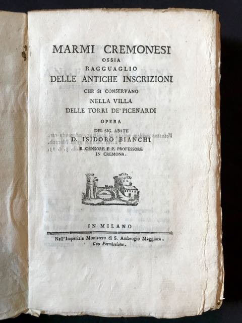 <span style="font-style: normal;">In-8° (cm. 22,5), brossura azzurrina muta coeva, pp. [8] CCCXIV [10] in ottimo stato, fresche e in barbe, con 33 tavole illustrative in rame f.t. (da Giovanni Beltrami) in fine; dedica ad Angelo Querini, alcune graziose testatine silografiche. Prima edizione di quest'opera erudita del frate camaldolese (già conosciuto per le sue </span><i>Meditazioni su varj punti della felicità pubblica</i>) che descrive la collezione di cippi raccolta dai Picenardi nella loro villa nei pressi di Cremona. Cfr. Lozzi 1373; Platneriana 118. Ottimo esemplare. (SE1)