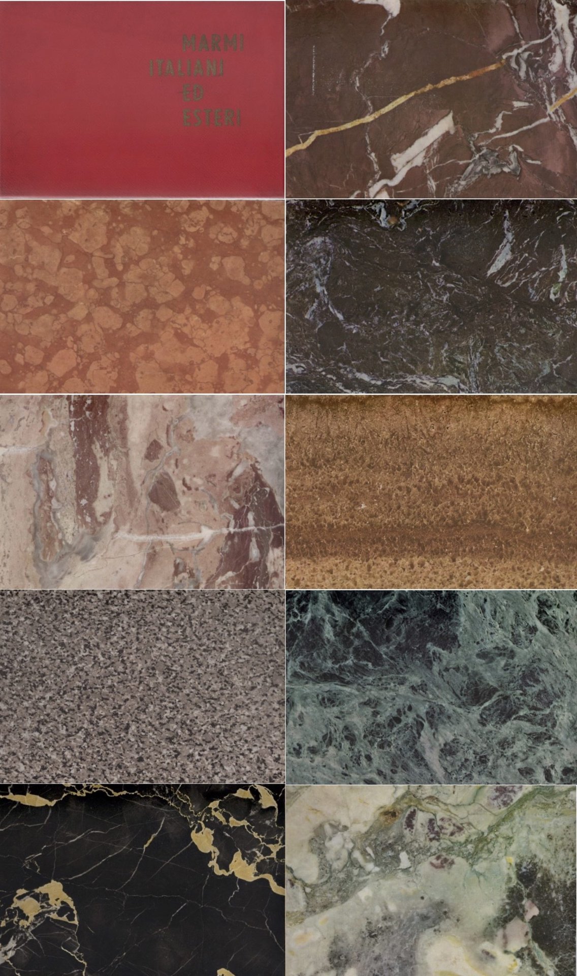 Affascinante catalogo che annovera 59 tipi di marmi, stampati a colori su carta fotografica, ognuno corredato del proprio specifico nome. Album in similpelle, all'interno brossura con legatura a spirale, la prima carta, su cui è riprodotto l'indice delle tavole, è volante, una tavola risulta incollata alla successiva.