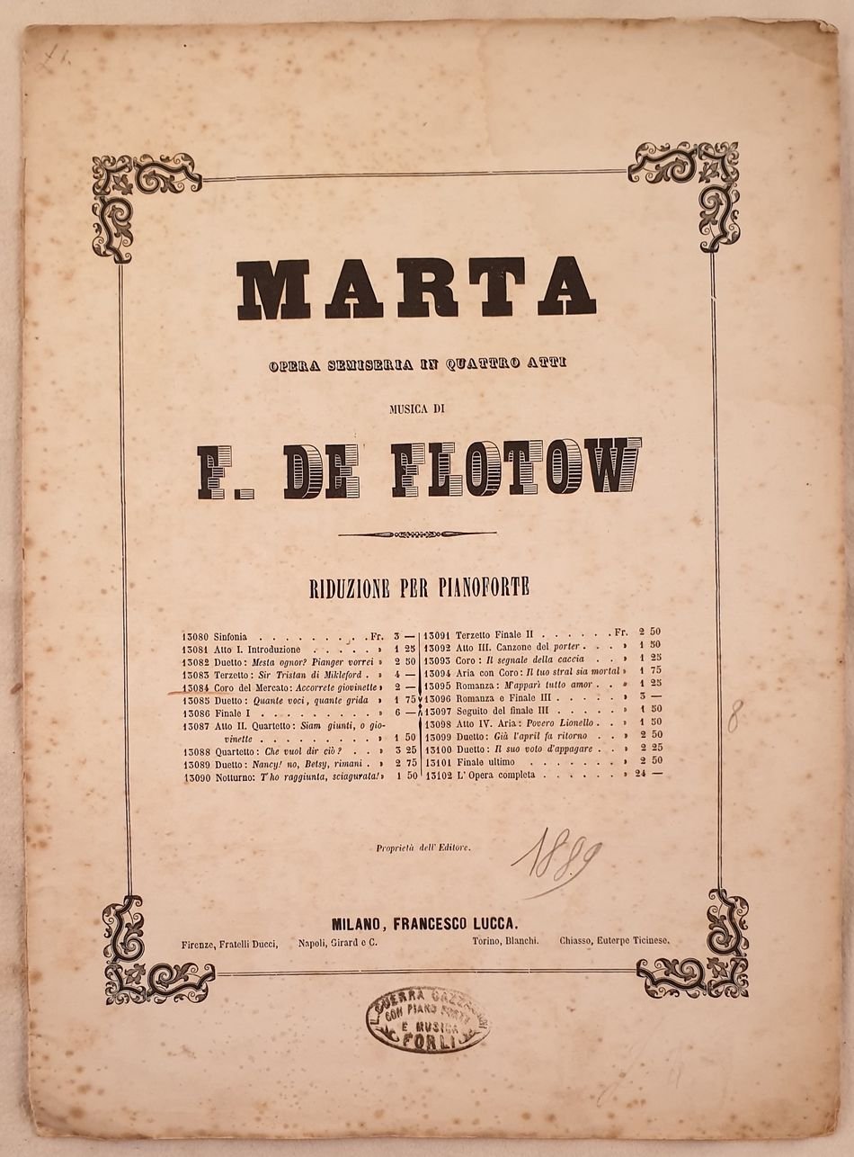 Bello spartito per pianoforte del 1880 circa della melodia "Coro del Mercato Accorrete giovinette" tratta dall'opera Marta del compositore tedesco Friedrich Von Flotow (1812-1883). In ottime condizioni con fioriture. Copertina in buone condizioni generali con lievi usure au margini e dorso. Legatura in buone condizioni. Pagine in ottime condizioni con rare fioriture. Formato cm. 36x26. Pp. 6. Beautiful musical score of 1880 circa of the melody "Coro del Mercato Accorrete giovinette" for piano formt he work Marta byt hegerman composer Friedrich Von Flotow (1812-1883). In good conditions with foxings. Cover in good conditions slightly worn in the edges and spine. Binding in good conditions. Pages in very good conditions with occasional foxings. Formato cm. 36x26. Pp. 6.