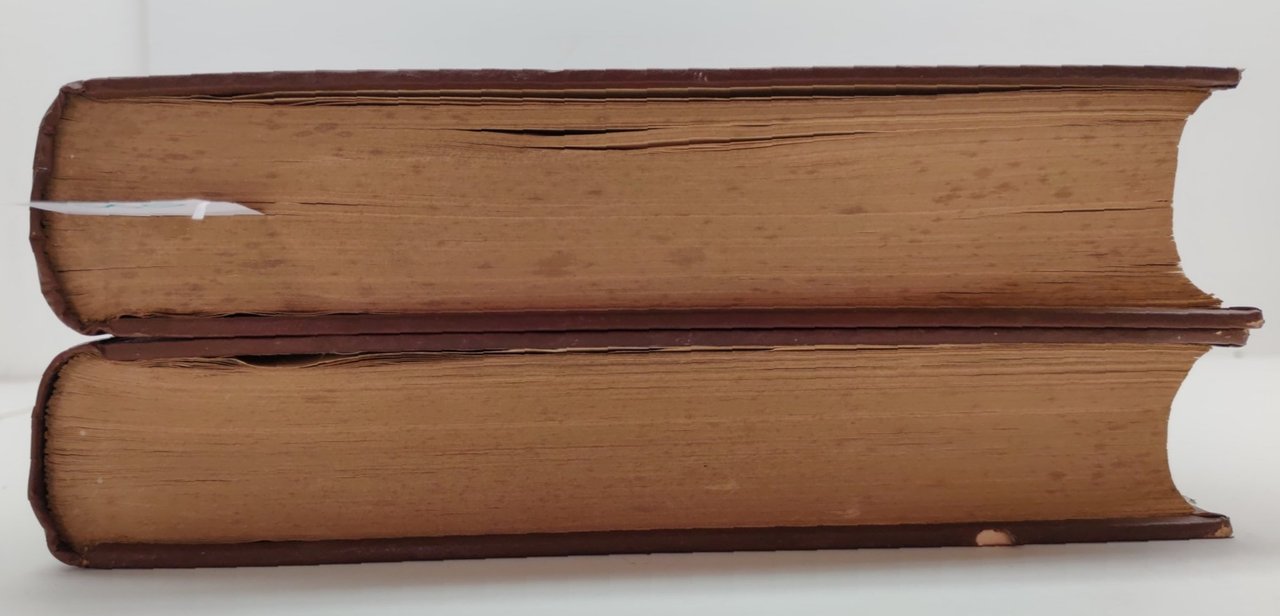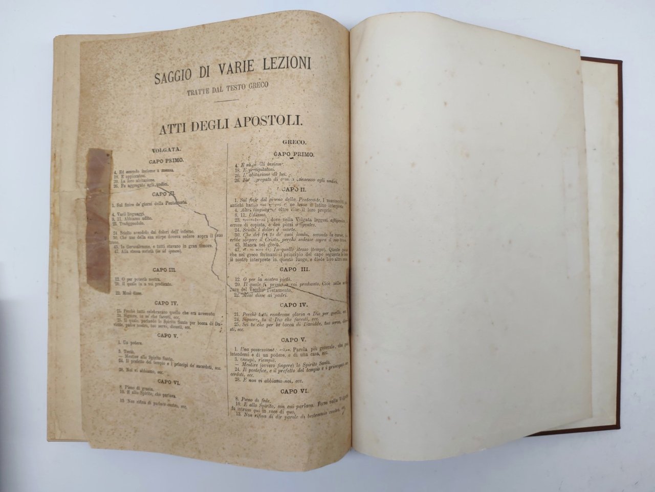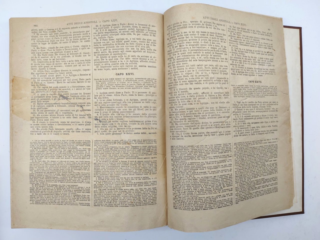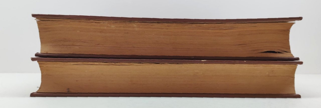 Mancano i frontespizi in entrambe i volumi, legatura rigida in pelle con titoli in oro al dorso, alcuni segni di usura. Tagli bruniti con fioriture e sporcizie diffuse, specialmente quelli superiori. fogli di guardia con fioriture, alla prima pagina alcune annotazioni a matita. pagine interne con fioriture che non ostacolano la lettura, testo stampato su due colonne. Margine esterno delle pagine brunito. Nel primo volume, pagina 758 con una piega al margine superiore. lieve deformazione al margine superiore esterno di alcune pagine. Secondo volume con una lieve abrasione al margine superiore del piatto anteriore. Le ultime quattro pagine del secondo volume presentano vistosi strappi, riparati con nastro adesivo per restauro. L'ultima pagina è anch'essa riparata con nastro adesivo. N. pagine 847 dimensioni di ciascun volume cm. 31,5 x 24,5 x 4,5