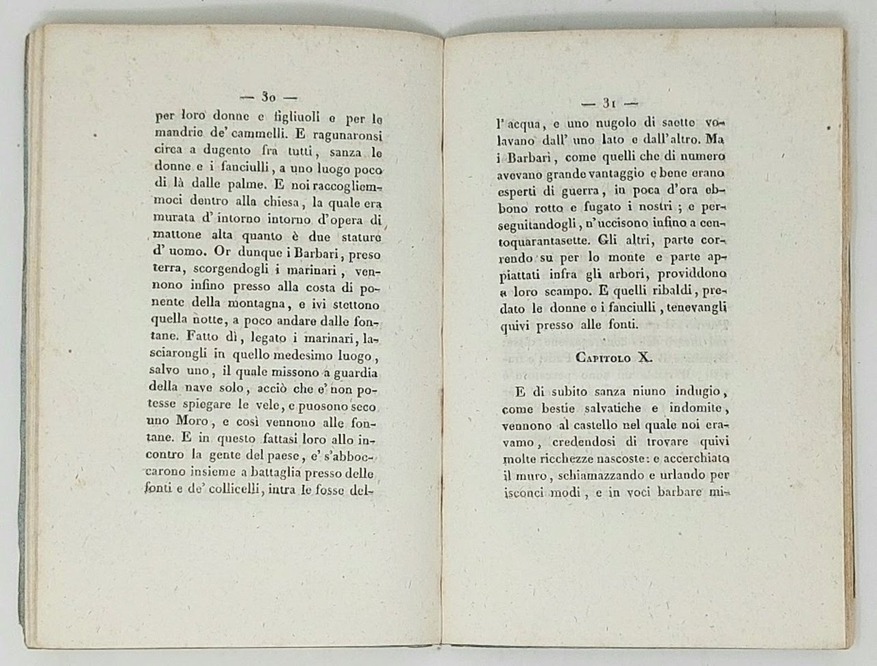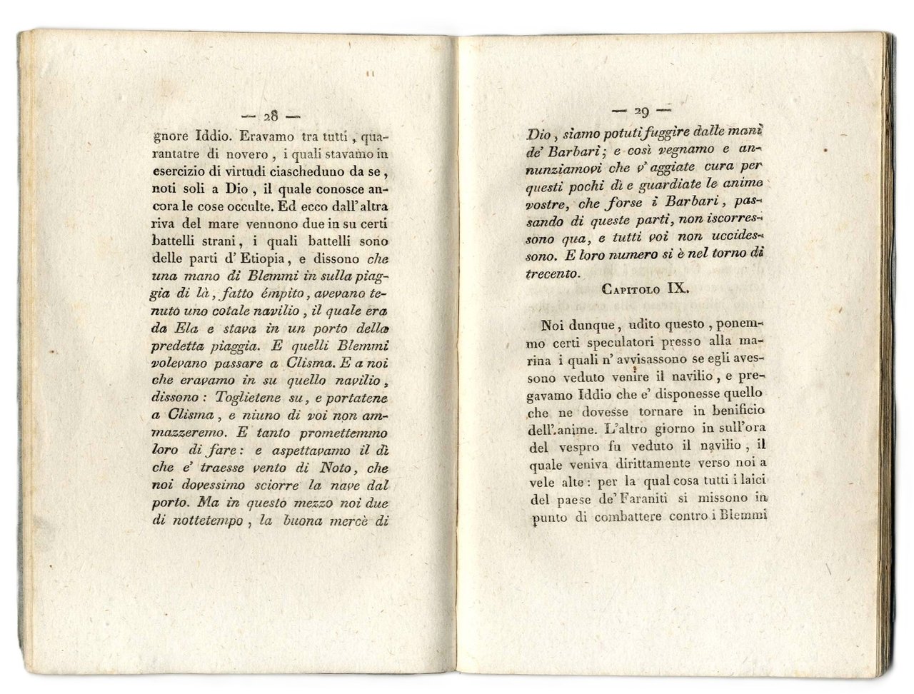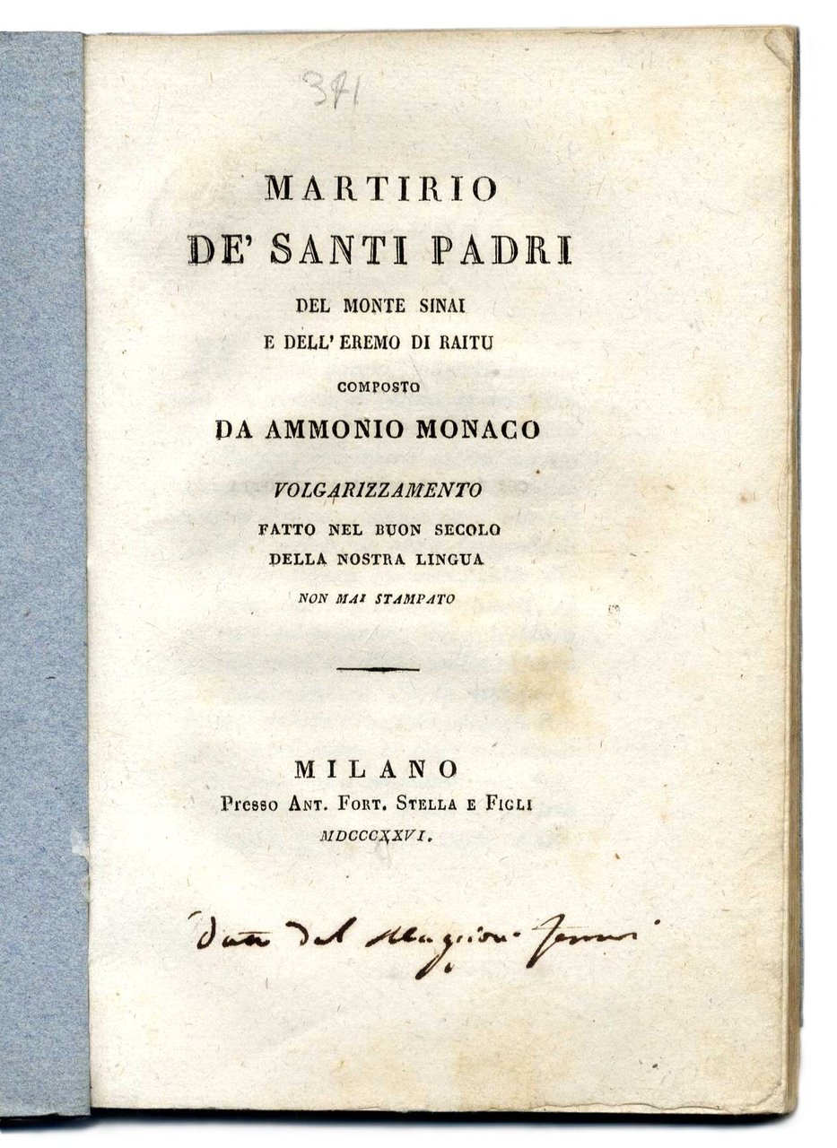 >in-8, (208 x 139 mm); pp. 55, brossura azzurra muta. Rara edizione originale. Come noto, si tratta di una presa in giro: falso è il nome dell'autore e falsa la definizione di "volgarizzamento", l'opera è infatti un'invenzione del Leopardi, "piacevole burla di quel grande letterato" (cfr. Cappelletti), che produsse una raffinatissima mistificazione letteraria non solo del testo, ma anche della lingua trecentesca, nella quale scrisse la "traduzione". Incerto è quanto afferma il Cat. Fondo Leopardiano (Comune di Milano,1958), n. 81: "Non contraffazione leopardiana di uno scritto del Trecento, ma in realtà veramente traduzione da Francesco Combefis "Illustrium Christi martyrum lecti Triumphi vetustis Graecorum monumentis consignati" (Parigi, 1660), opera citata da Leopardi nella prefazione al libro". Il testo riporta un'antica leggenda agiografica ed è la narrazione del monaco Ammonio, che fu testimone della doppia strage di 38 monaci sul monte Sinai e di 43 monaci nell'eremo di Raithu, località a sud-ovest del Sinai, avvenuta durante il regno dell'imperatore Diocleziano per mano dei Saraceni e dei Blemmi. Buon esemplare, marginoso e fresco, nota coeva a penna al frontespizio (lieve e sporadiche macchiette, più marcate solo a alle ultime 3 pp.). Mazzatinti, 662. Cappelletti, p. 17. Gamba, 1114. Cat. Fondo Leopardiano, n. 81. Melzi, I, p. 47. Parenti, p. 308. Benedettucci, 29