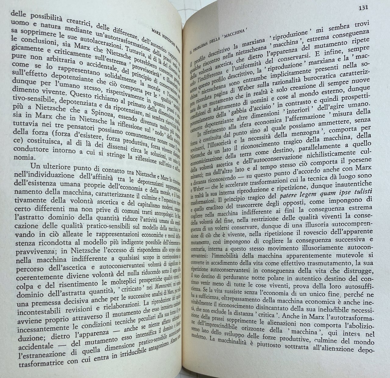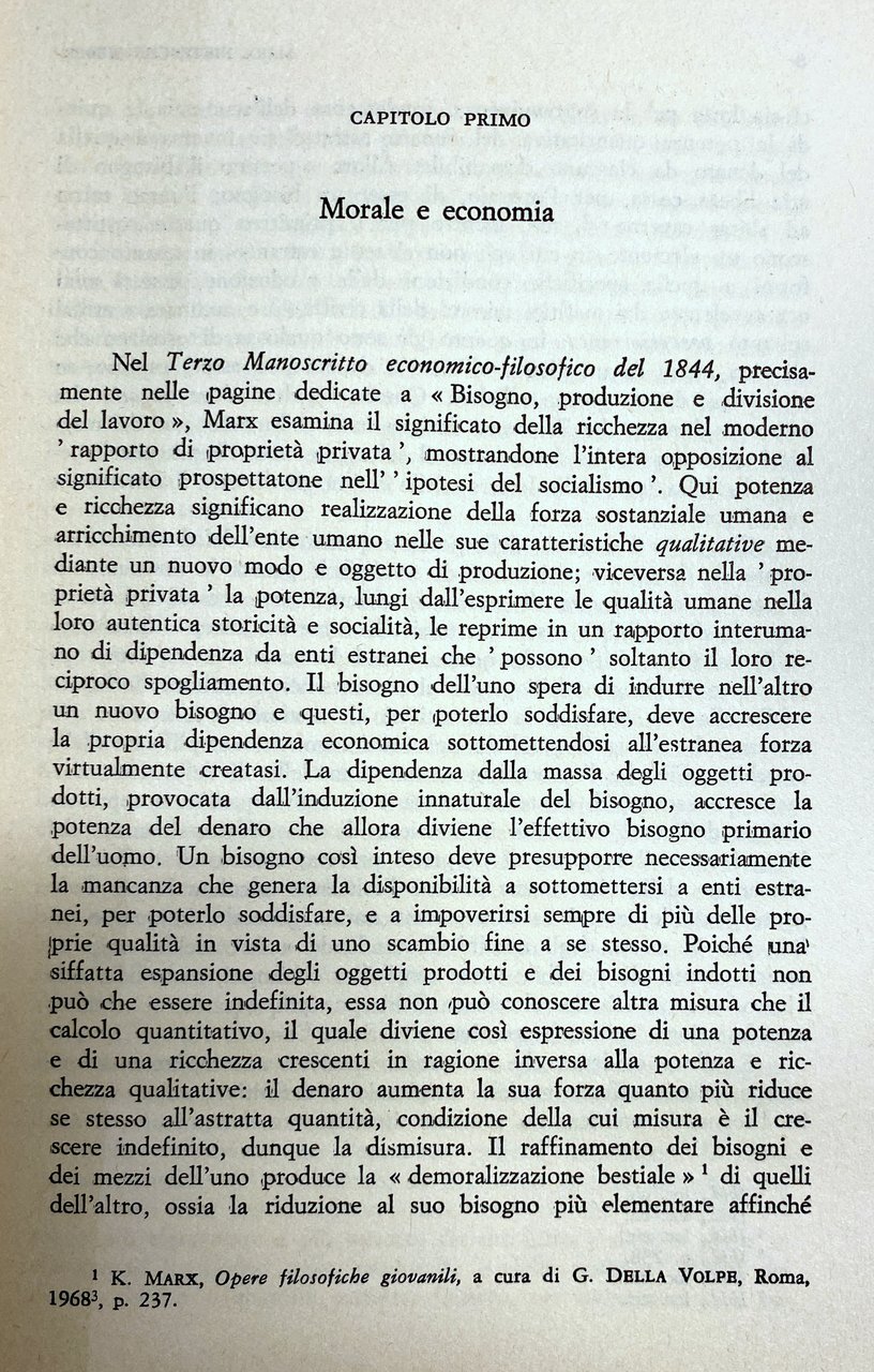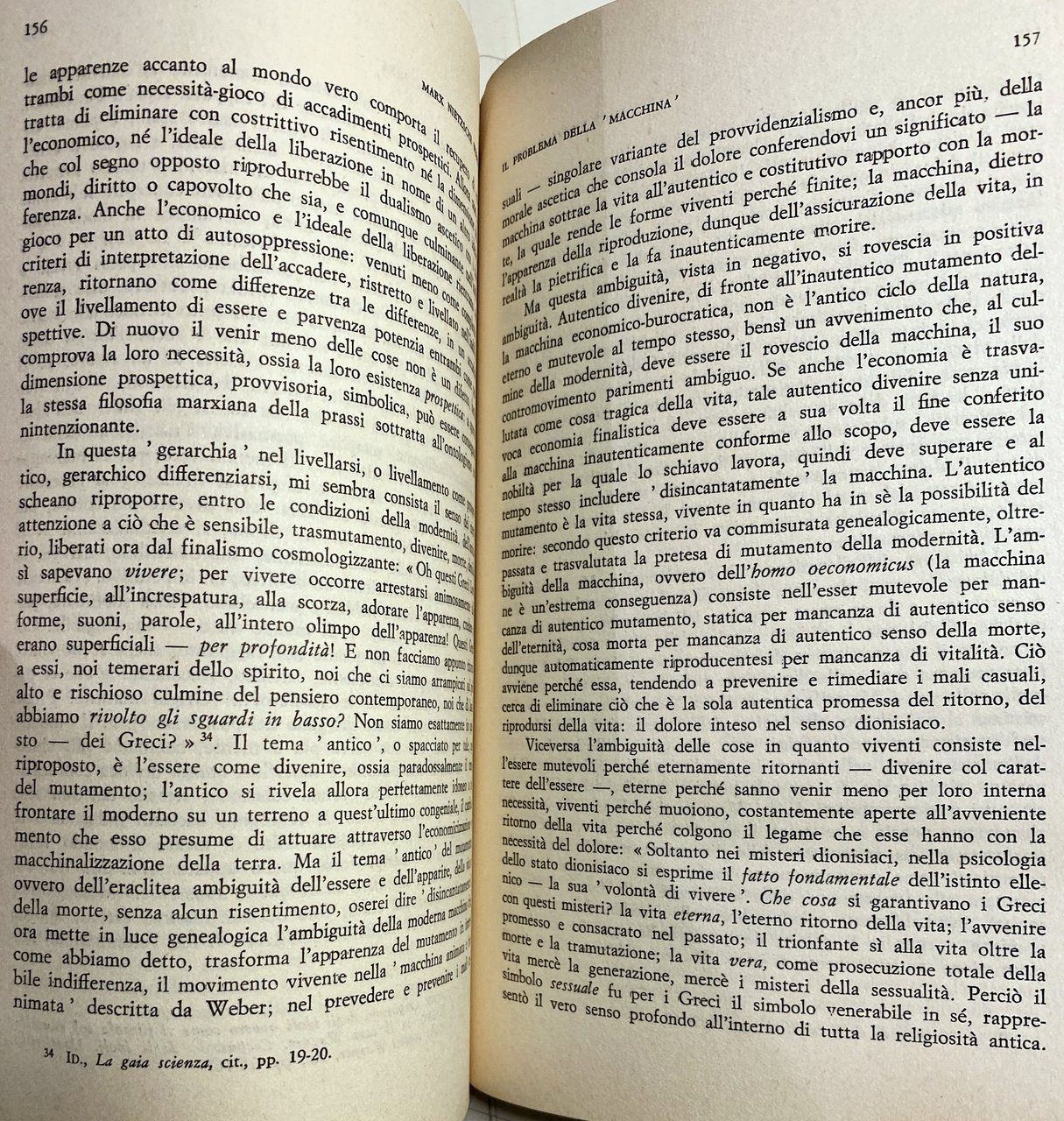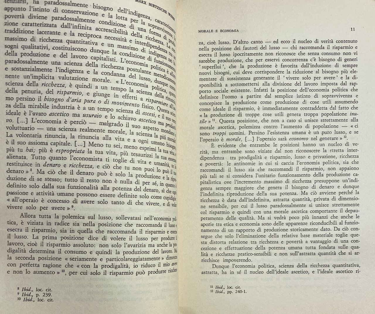 Soggetti: Filosofia, Marxismo, Umanismo, Etica, Economia, Morale, Autoconservazione, Macchina, Cultura, Lotta di classe, Critica, Saggi critici, Politica, Potere, Potenza, Nichilismo, Etica, Ricchezza, Manoscritti, Merce, Bisogni, Dipendenza, Proletariato, Proprietà, Sfruttamento, Opere filosofiche giovanili, Bibliografia, Riferimento, Libri Vintage fuori catalogo, Saggistica, Eschilo, Prometeo, Denaro, Moneta, Produzione, Surplus, Profitto, Risparmio, Lusso, Beni, Lavoro, Espropriazione, Consumismo, Rapporti, Sussistenza, Forza, Diritto, Capitalismo, Dialettica, Materialismo storico, Società, Sociologia, Nietzsche, Frammenti, Giorgio Colli, Montinari, Interpretazione, Giuseppe Lissa, Gaetano Della Volpe, Storicismo, Polemiche, Genealogia, Macchina, Tecnica, Necessità, Provvidenza divina, Idealismo, Burocrazia, Fenomenologia, Spinoza, Libertà, Schiavitù, Raymond Aron, Felicità, Adorno, Baumgarten, Analisi, Collezionismo, Consultazione, Gaia Scienza, Spirito dionisiaco Philosophy Marxism Humanism Ethics Economy Morality Self-preservation Machine Culture Class struggle Criticism Critical essays Politics Power Mighty Nihilism Wealth Manuscripts Commodity Needs Dependence Proletariat Property Exploitation Youth philosophical works Bibliography Reference Out of print books Non-fiction Aeschylus Prometheus Money Coin Production Profit Savings Luxury Goods Working Expropriation Consumerism Relationships Subsistence Strength Law Capitalism Dialectics Historical materialism Society, Sociology Fragments Interpretation Historicism Controversy Genealogy Machine Technique Necessity, Divine Providence Idealism Bureaucracy Phenomenology Freedom Slavery Happiness Analysis Collectibles Consultation Gay Science Dionysian Spirit Borghesia Bourgeoisie