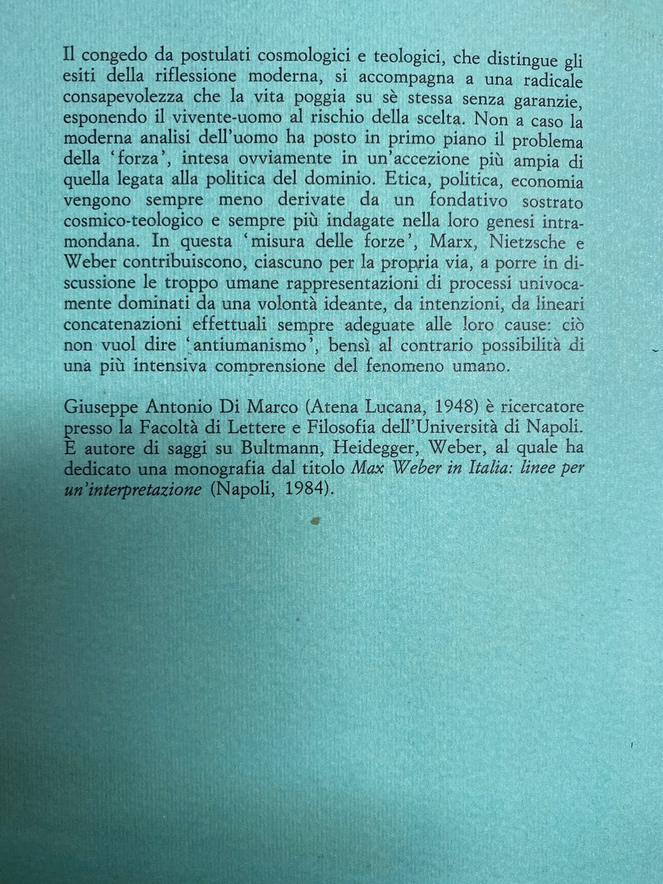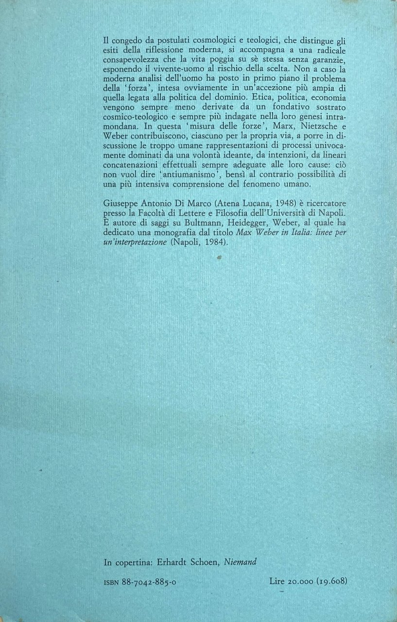 Il congedo da postulati cosmologici e teologici, che distingue gli esiti della riflessione moderna, si accompagna a una radicale consapevolezza che la vita poggia su sé stessa senza garanzie, esponendo il vivente-uomo al rischio della scelta. Non a caso la moderna analisi dell'uomo ha posto in primo piano il problema della forza, intesa ovviamente in un'accezione più ampia di quella legata alla politica del dominio. Etica, politica, economia vengono sempre meno derivate da un fondativo sostrato cosmico-teologico e sempre più indagate nella loro genesi intra-mondana. In questa misura delle forze, Marx, Nietzsche e Weber contribuiscono, ciascuno per la propria via, a porre in discussione le troppo umane rappresentazioni di processi univocamente dominati da una volontà ideante, da intenzioni, da lineari concatenazioni effettuali sempre adeguate alle loro cause: ciò non vuol dire antiumanismo, bensì al contrario possibilità di una più intensiva comprensione del fenomeno umano.