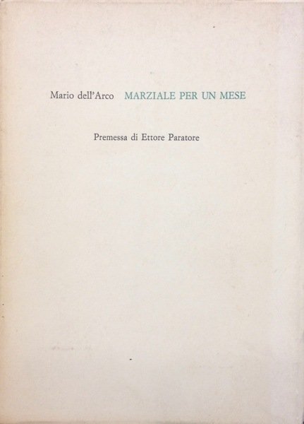 Raro volume di poesie di Dell'Arco. Tiratura limitata di 99 copie (66 per i lettori di M.Dell'Arco e 33 per gli amici di E.Paratore), testo latino a fronte, copertina flessibile, brossura editoriale bianca, con titoli verdi e neri, dorso leggermente ingiallito, pp 83