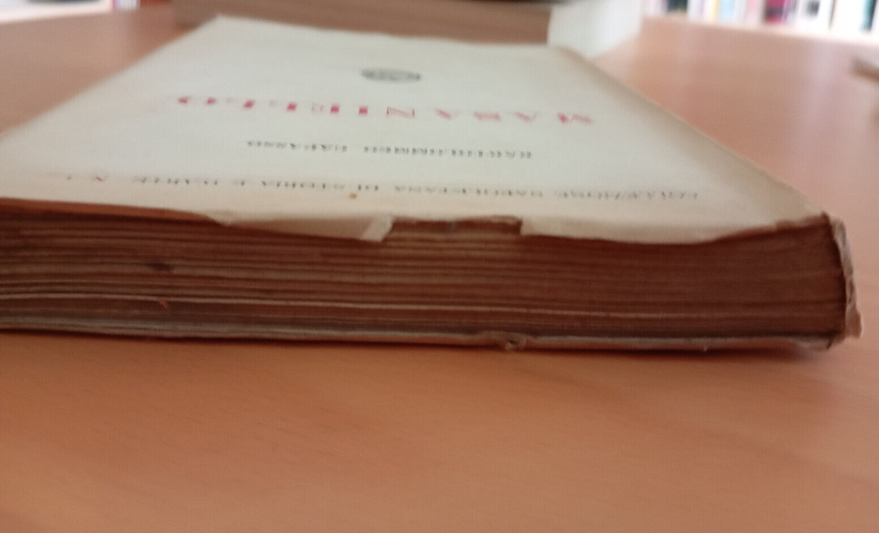 Copertina scurita, con scolororiture, maccihe e segni di usura, come da foto. Tagli fortemente scuriti con fioriture, legatura debole ma non compromessa, pagine ingiallite, presente un timbro ex libris e etichetta bibliotecaria nelle pagine iniziali, come da foto