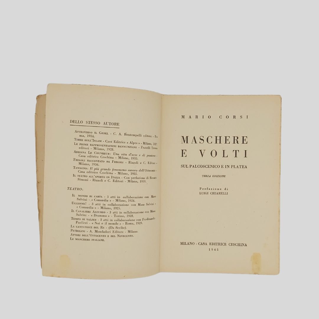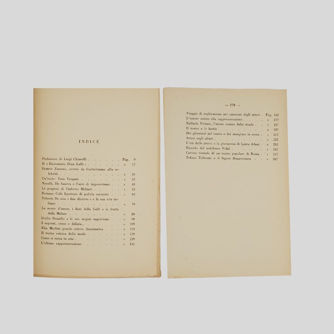 In-8° (cm 20,8), pp. 278. Rievocazione di attori ed attrici del teatro italiano tra la fine dell’800 e la prima metà del ‘900: Dina Galli, Ermete Zacconi, Vera Vergani, Ermete Novelli, Romano Calò, Vittorio De Sica, Giulio Donadio, Elsa Merlini, Raffaele Viviani.