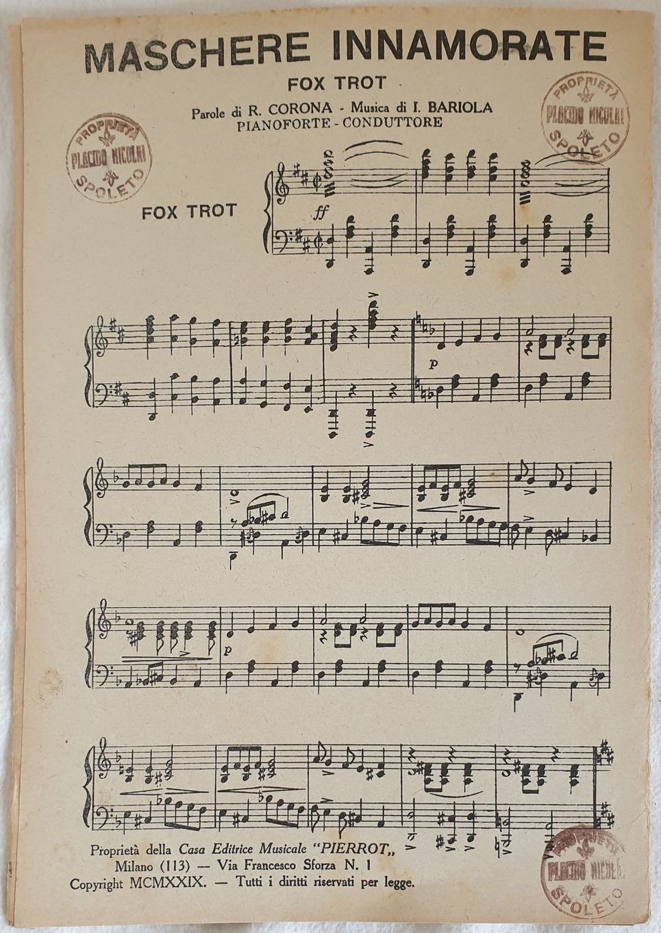 Bello spartito, partitura completa per orchestra del 1929 di una canzone di Romolo Corona.<BR>Copertina mancante. GENERE: fox trot STRUMENTI: pianoforte, violino, violoncello, contrabasso, clarinetto, flauto, batteria, tromba, trombone<BR>ANNO: 1929 DIMENSIONI: In 8. cm 25,5x18 PAGINE: 11CONDIZIONI: In buone condizioni NOTE: Ex libris alla prima pagina Beautiful score of one song by Romolo Corona, a complete score for orchestra of 1929. <BR>Cover lacks. MUSIC: STRUMENTI: piano; violin; violoncello; contrabbass; flute; clarinet; drums, trumpet, trombone YEAR: 1929 SIZE: In 8. cm 25,5x18 PAGES: pp. 11 CONDITIONS: In good conditions NOTES: ex libris in the first page