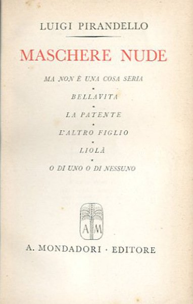 410 p. ; 19 x 12 cm. Tutto il teatro di Luigi Pirandello, 8. Come per le novelle, Pirandello concepì un’edizione complessiva della sua opera teatrale che raccogliesse tutti i drammi scritti. L’editore Bemporad prima e Mondadori dopo ne intrapresero la pubblicazione che coprì un ampio arco temporale. Pirandello diede alla raccolta il titolo unitario di Maschere nude, che esprime il senso ultimo riposto dall’autore agrigentino nel proprio teatro: nella fattispecie il rapporto problematico tra l’identità e il ruolo che ciascuno interpreta nella società e la relazione tra realtà e rappresentazione, che nell’opera di Pirandello è rivestita di un significato ulteriore. Infatti è proprio al teatro che Pirandello delega lo smascheramento dei cliché e dei ruoli cui gli uomini sono costretti nella vita: a teatro lo sdoppiamento tra attore e personaggio – quel complesso rapporto che tiene insieme l’uomo in carne e ossa con il ruolo che deve interpretare, fondamento di ogni rappresentazione teatrale e di ogni “finzione” –, si moltiplica per mostrare la lacerazione dell’uomo e la frantumazione della propria identità. Il personaggio (la “maschera”) viene mostrato “nudo”, cioè inerme e incapace di opporre resistenza alla frammentazione dell’identità cui è soggetto: è quindi sul palcoscenico che si riesce finalmente a mostrare la falsità delle convenzioni, i giochi di ruolo, l’incomunicabilità che mina ogni sana relazione umana. Legatura editoriale, coperta in cartone rigido telato di colore verde con titolo impresso al dorso, muto al piatto. Segni del tempo alla coperta, al taglio e alle pagine interne (fioriture e ingiallimento), libro accettabile da studio. Firma di appartenenza con data (Roma, 1° aprile 1943). Codice libreria 5002.