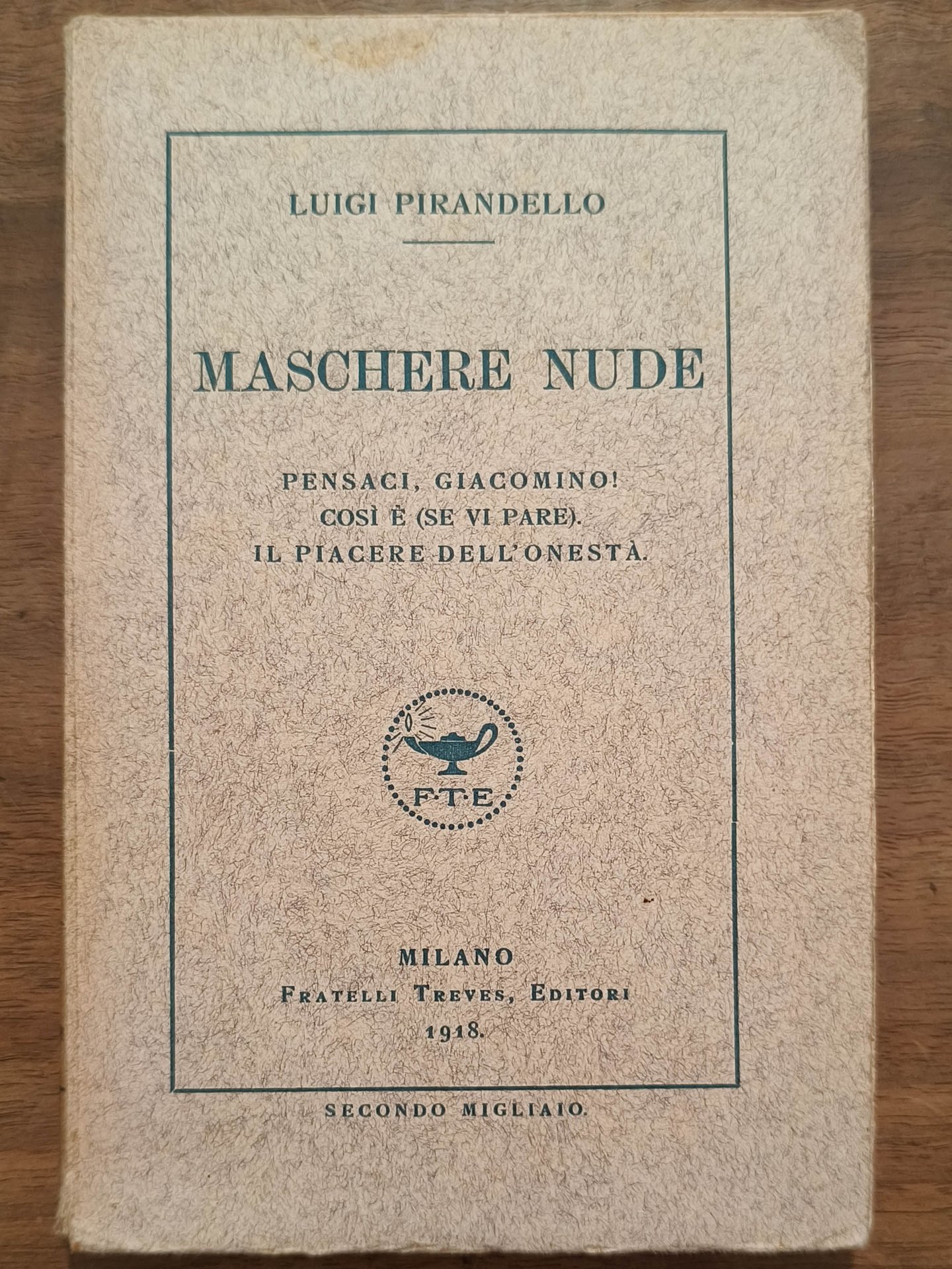 Maschere nude. Pensaci giacomino!; Così è (se vi pare); Il piacere dell'onestà, Milano, Treves, 1918. Prima edizione. Secondo migliaio. Cm 19. Pp. (6) 291; 15. Brossura editoriale. Dorso scolorito.
