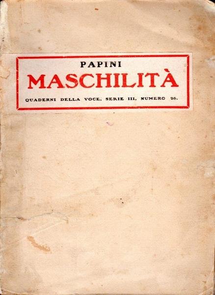 Maschilità, prima edizione aprile 1915, pp. 164, formato 15 x 20,5.<BR>Copertina morbida di colore beige con titoli in nero e rosso al piatto anteriore. <BR>Dorso restaurato. Condizioni accettabili.