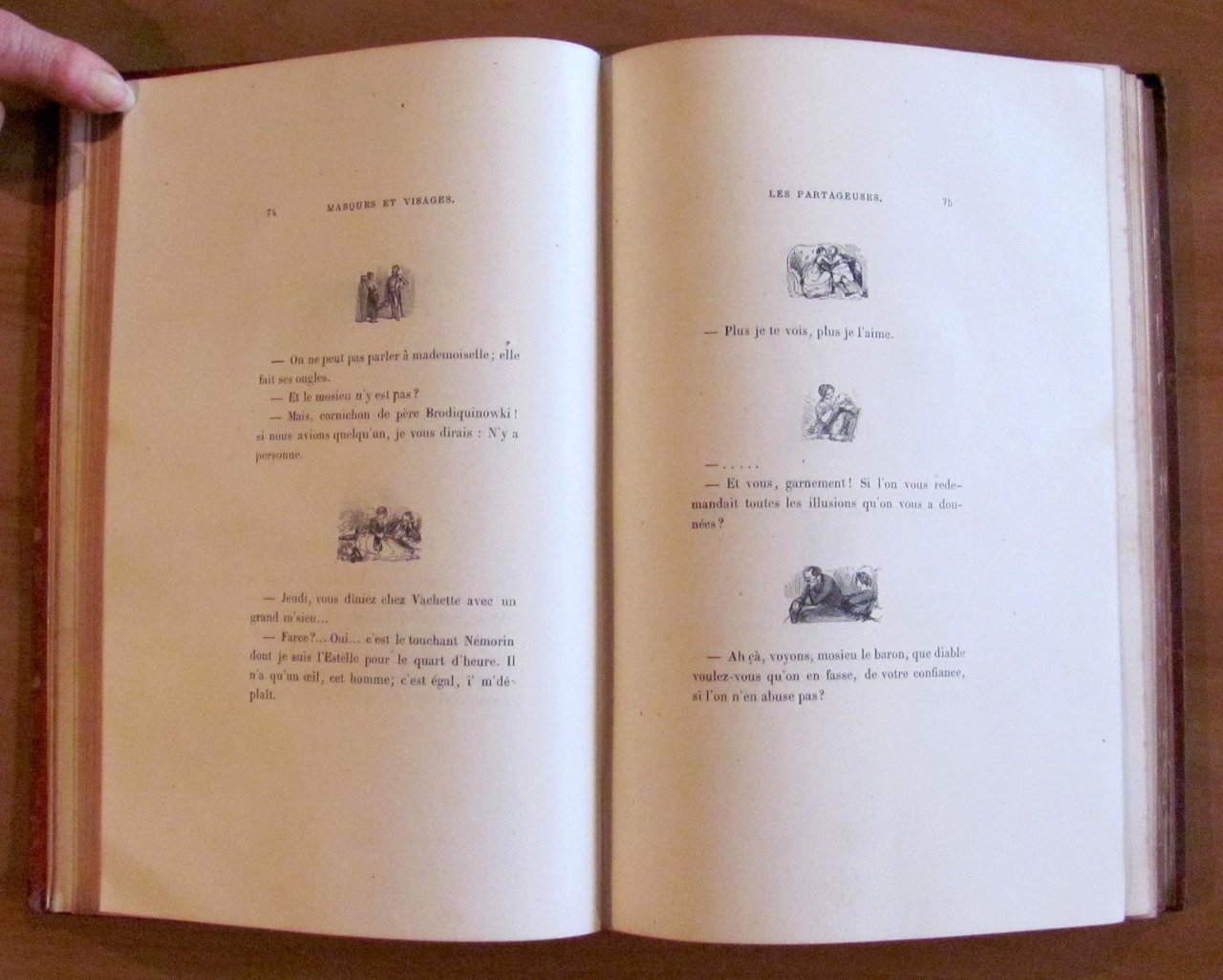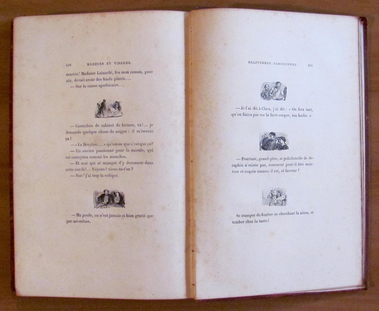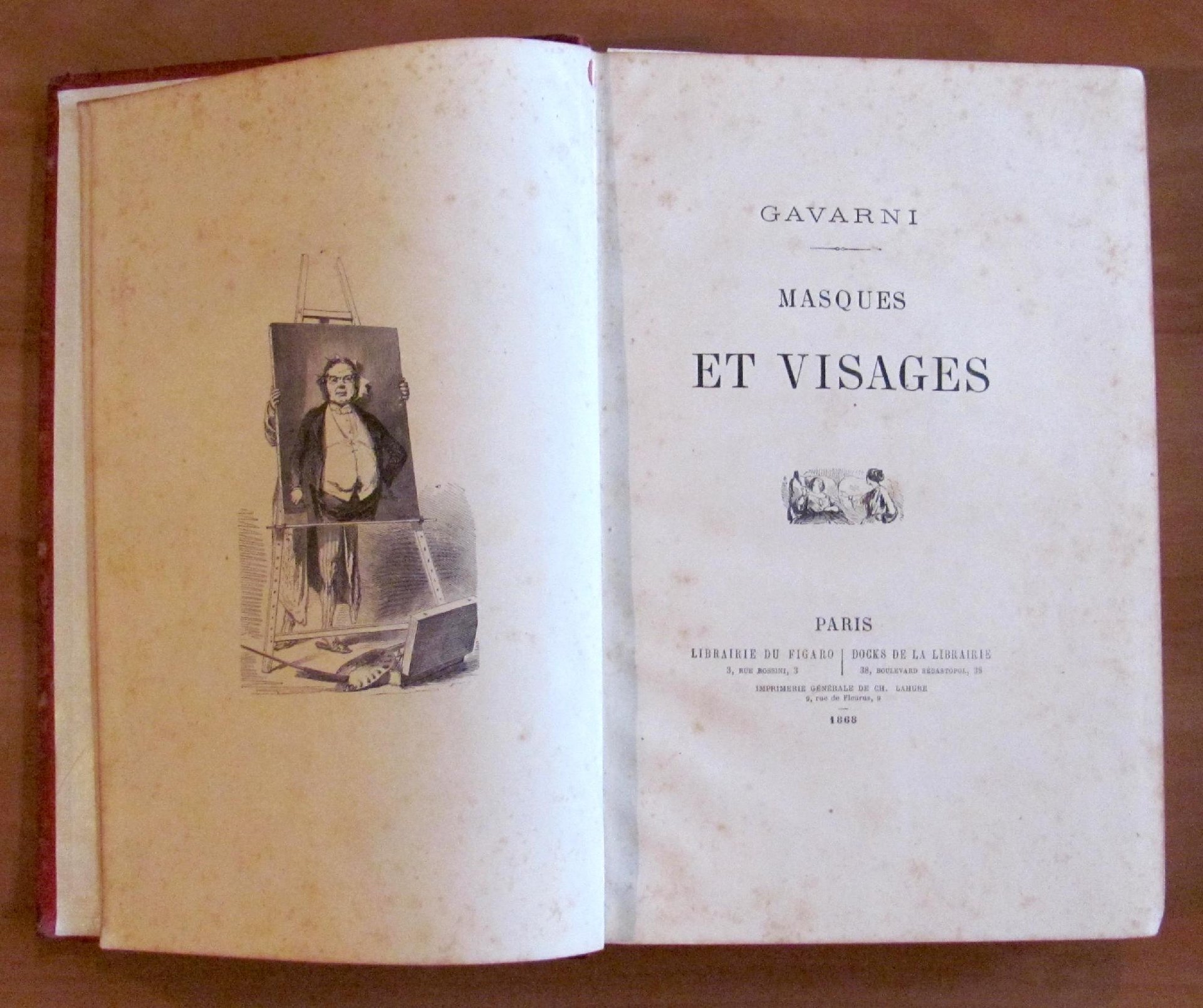 Una illustrazione in b/n in antiporta a piena pagina, autoritratto in b/n f.t. e moltissime piccole illustrazioni in b/n n.t. di Gavarni. Libr. Du Figaro - Paris, 1868. Tela editoriale con titoli impressi a secco al piatto e fregi e titoli in oro al dorso. Tagli dorati alle pagine. Lievi usure del tempo alle cerniere e alle cuffie del dorso. Minime sporadiche fioriture del tempo a qualche pagina ma freschissimo. 18,5x27; pp.352. Raro e in Buonissimo stato. , Molto buono (Very Good)