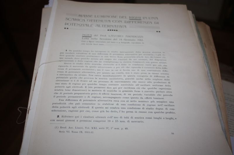 Cod 3422, MASSE LUMINOSE DEKìL RIGHI IN UNA SCARICA OTTENUTA CON DIFERENZA DI POTENZIALE ALTERNATIVA LAVORO AMADUZZI 14 GENNAIO 1912 ACCADEMIA DEI LINCEI , DA PAG 93 A PAG 98 ILLUSTRATO