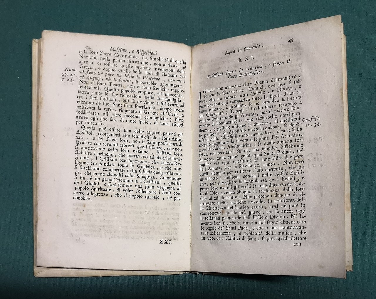 >in-8, pp. 80, leg. coeva p. perg. Prima edizione italiana di questo scritto polemico pubblicato per la prima volta a Parigi nel 1694, col quale l'autore, nell'intento di correggere e migliorare i costumi del suo tempo, s'inserisce nel filone della tradizionale condanna ecclesiastica degli spettacoli, mettendo in luce le nefandezze che, secondo lui, il teatro nasconde sotto il belletto della vita mondana. Interessante il riferimento alle presunte "empietà" e alle "infamie" di cui "son piene le commedie di Molière" o l'appello, in più punti, alle laiche autorità di Platone e Aristotele. Jacques-Bénigne Bossuet (1627-1704), vescovo di Meaux, fu celebre oratore barocco, indefesso difensore della Chiesa contro giansenismo e quietismo. Buon esemplare (sul titolo piccola lacerazione della carta per ossidazione da inchiostro). RASI 305 (ediz. Venezia 1753).