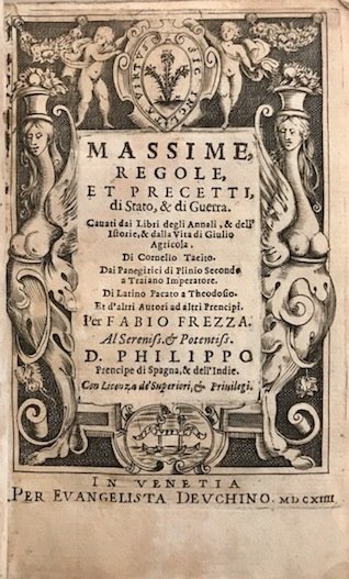 Massime, regole, et precetti di Stato, & di Guerra cavati dai Libri degli Annali, & dell’Istorie, & dalla Vita di Giulio Agricola di Cornelio Tacito. Dai Panegirici di Plinio Secondo a Traiano Imperatore. Di Latino Pacato a Theodosio. Et d’altri Autori ad altri Prencipi.