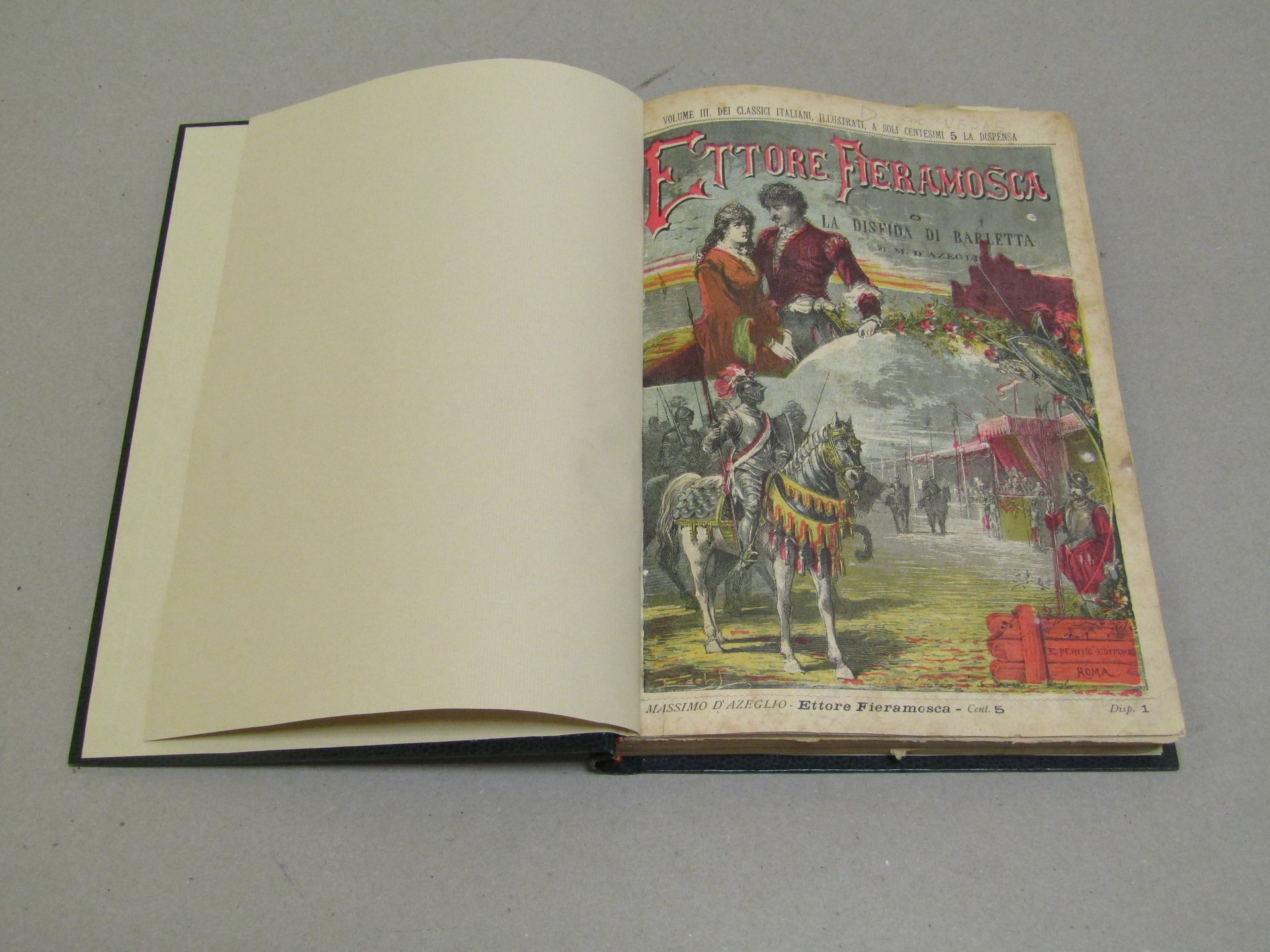 Volume ben conservato all'esterno, pagine ingiallite, non rifilate. Bbilioteca illustrata dei classici italiani: fascicoli raccolti e rilegati del Fieramosca e de I Palleschi e i Piagnoni.