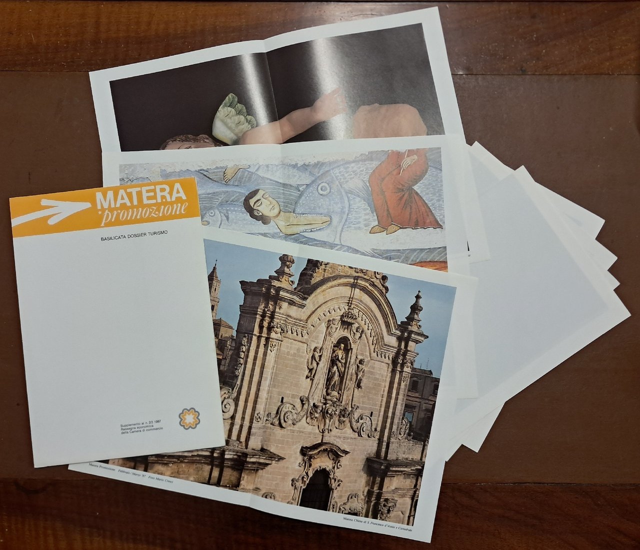 Matera promozione. Rassegna economica della Camera di commercio, direttore responsabile Nicola De Benedictis, Camera di Commercio Matera, anno XXXVIII, nn. 2-3, febbraio-marzo 1987, pp. 248, ill. b.n. e col., cm 30, br. ed. In allegato: Cartellina in cart. ed. contente sette tavole sciolte cm 40x29 ill. col. con riproduzioni fotografiche con dettagli artistici materani (Supplemento a Matera promozione, nn. 2-3, 1987). Indice: Gaetano Michetti, Basilicata, coraggio e orgoglio di una regione in cammino – Angelo Tosto, Turismo è progresso – Nicola De Benedictis, Dalla cultura all’economia – Daniele Cappiello, Basilicata dossier turismo: perché – Dagli aridi calanchi tutta l’acqua del Sud – Leonardo Sinisgalli, Lucania – Robert Fox, Tourism in Basilicata: but will the tourist stop at Eboli, too? – Michele Schiuma, Spazi luminosi, grandi silenzi – Charles Lister, Then and now. Diaries 1960 and 1986 – Irene Lieflander, A casa di… Lukanisches Tagebuch – Giovanni Russo, Cara Basilicata – Eelco Hesse, A girl from Baragiano – Giovanni Bechelloni, M’intrigano carattere e sentimenti della gente – Cid Corman, Aria di Matera – Mario Trufelli, Lucania – Robert Bergeron, Quelques considerations sur le tourisme en Materano – Vittorio Boccaletti, Quali strategie per lo sviluppo turistico – Gian Maria Fara, Solo turismo di ritorno… perché accontentarsi del poco? – Domenico Palmiotti, Recuperare il tempo perso: è la ricetta degli amministratori – Angelo Lorusoo, Il prodotto turismo è vendibile, ma… - Le politiche per il turismo – Antonio Duva, Turismo o industria? Nessun dilemma – Mari Dilio, Progettare un nuovo turismo, dove il tempo è abolito – Dionisio C. Vitelli, Piano paesistico approvato, patrimonio ambientale salvato – Nino D’Agostino, Nei servizi i necessari fattori propulsivi – Patrizio Sicolo, Progetto Fio Matera cultura, e crescerà anche l’economia – Francesca Padula, Agricoltura e turismo: come fare il matrimonio – Michele Pace, All’ombra dell’Abbazia di Montescaglioso – Domenico Colonna, Il progetto Appia antica, un museo delle aree interne – Ugo Verolino, Escursioni difficili senza trasporti efficienti – Dinu Adamesteanu, Come ho trasformato le pietre in oro – Che fenomeno quei monaci bizantini – Dieter Mertens, Goldene Ahren fur das Orakel – Beatrice Volpe, Basilicata o Lucania: capriccio o bisticcio culturale? – Pierre Gaudibert , Matera, una città mediterranea - Vito e Delia Ripoli, Quanto lavoro per l’agenzia di promozione turistica – Giulio Cocca, Da Policoro a Gallipoli Cognato, un mare di verde – Mario Tommaselli, Pollino: quando i piani sono solo parole – Felice Lafranceschina, Tutela dell’ambiente e gestione del territorio: il caso Pollino – Pasquale Doria, Feste e folclore scoppiettano ancora – Beatrice Conte, A tavola con i lucani – Raffaele Ruta, Roma und Matera – Ciro Petrarulo, Dallo Jonio escursione a Grottaglie – Angela Staffieri, Dalla cultura della parola alla cultura dell’immagine – Rocco Scotellaro, Lucania – Traduzioni/Abstracts. Leggere tracce d’uso, per il resto ben conservato. Perfette le tavole in allegato.