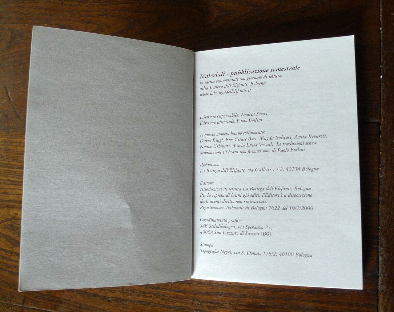 MATERIALI n.2 ottobre 2006.Pubblicazione semestrale.LIBRI CHE MERAVIGLIANO E MUOVONO.Direttore responsabile: Andrea Severi.Direttore editoriale: Paolo Bollini.Associazione di lettura La Bottega dell'Elefante,Bologna 2006,brossura, 17x12 cm., pp.171,peso: g.300
