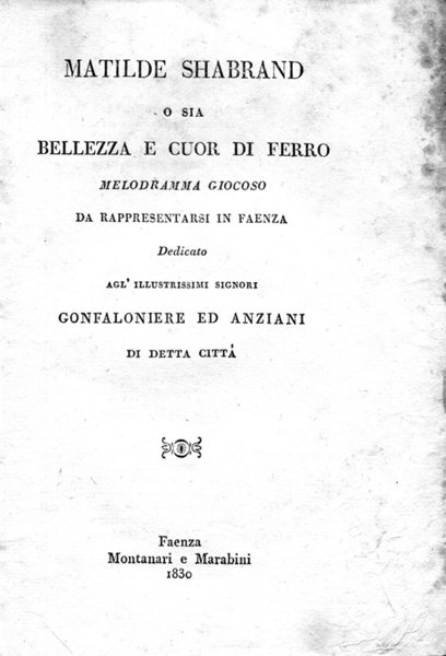 Libretto d’opera. Melodramma giocoso da rappresentarsi in Faenza. Elenco dei personaggi completo dei nomi degli interpreti tra cui Giovanni Munticchielli e Albina Stella di Bologna.